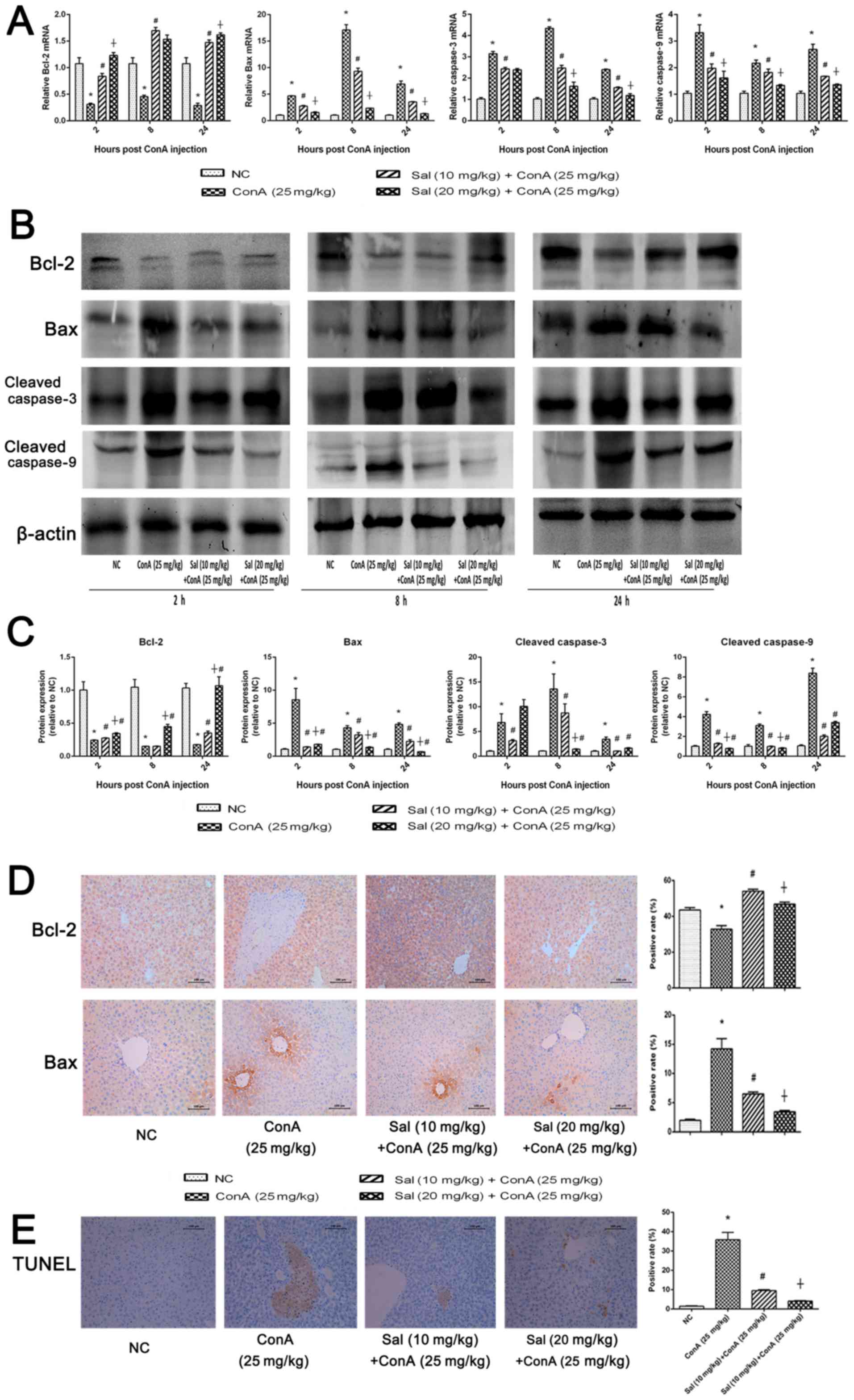 B-cell lymphoma-2 (Bcl-2) is considered to be an anti-apoptotic protein, while Bcl-2-associated X protein (Bax), caspase-3 and caspase-9 are known to be markers of apoptosis (17). RT-qPCR and western blot analysis were performed to detect the expression of apoptosis markers at the mRNA and protein levels. As indicated in Fig. 4A-C, the relative expression of Bax, caspase-3 and caspase-9 was significantly enhanced at the three time points after ConA treatment compared with the control; however, this enhancement was significantly attenuated by pretreatment with Sal. Relative expression of Bcl-2 exhibited the opposite results. The results of immunohistochemical staining were consistent with those of qPCR and western blotting (Fig. 4D). Furthermore, a TUNEL assay was performed to investigate apoptosis levels in liver tissues. The positive areas, which represented apoptotic cells, were significantly larger in the ConA group compared with the NC group. However, in the Sal pretreated groups, the positive ratio was significantly decreased and 20 mg/kg Sal exhibited a larger effect compared with 10 mg/kg Sal (Fig. 4E). These results demonstrate that Sal may attenuate hepatocyte apoptosis in ConA-induced liver injury.