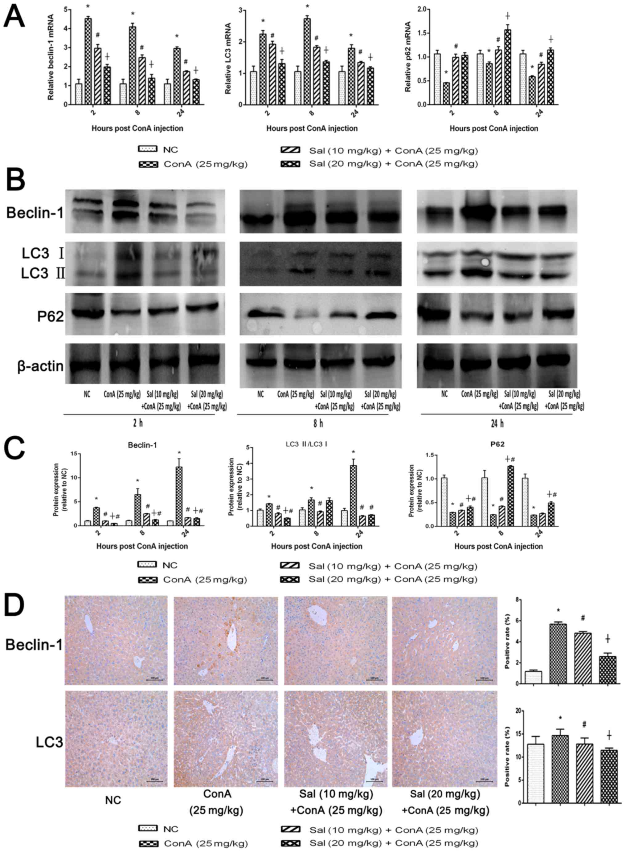 Beclin-1 and LC3 serve key functions in the process of autophagy (17). p62 is an ubiquitin-binding protein involved in autophagy that can be degraded in autophagosomes (41). RT-qPCR and western blot analyses indicated that ConA significantly upregulated beclin-1 and LC3 expression and significantly downregulated p62 expression compared with the control (Fig. 5A-C). However treatment with Sal reversed this effect, particularly Sal (20 mg/kg). There was an exception as Sal (10 mg/kg) had a better effect at inhibiting the ration of LC3 II/LC3 I at 8 and 24 h. This was consistent with the statistical analysis of the western blot analysis of TNF-α in Fig. 3D, where a higher TNF-α level may also lead to a higher level of hepatocytes injuries and autophagy. Immunohistochemical analysis revealed a significantly increased expression of beclin-1 and LC3 in the ConA group compared with the NC group (Fig. 5D). Treatment with Sal significantly downregulated the expression of beclin-1 and LC3 and Sal (20 mg/kg) was significantly more effective than Sal (10 mg/kg). (Fig. 5D). These results demonstrate that Sal inhibits autophagy in hepatocytes.