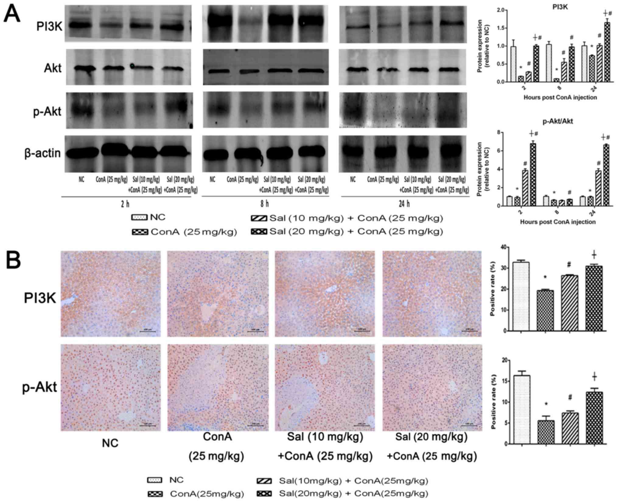 To determine whether the protective effect of Sal on ConA-induced liver injury is mediated by the PI3K/Akt signaling pathway, the protein levels of PI3K, Akt and phosphorylated (p-)Akt were detected. The results indicated that ConA injection downregulated PI3K and p-Akt/Akt at the three time points tested compared with the levels in the NC group. However, Sal pretreatment suppressed the decreasing effect significantly at 2 and 24 h (Fig. 6A). Immunohistochemistry of PI3K and p-Akt also indicated a significant decrease in protein levels in the ConA group compared with the control, and a significant increase in the Sal pretreated groups (Fig. 6B). In summary, these results indicate that Sal pretreatment may activate the PI3K/Akt signaling pathway in ConA-induced liver injury.