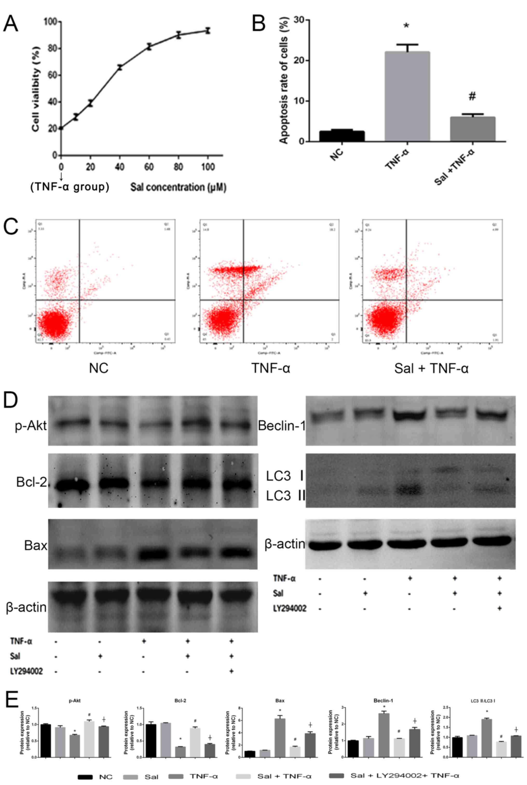 The hepatocyte viability was measured by CCK8 assay. In the Sal (0 µM) group where the cells were treated with TNF-α alone the viability of the cells was reduced to 21.55±1.52% (data not shown). When the cells were treated with Sal, their viability was then gradually enhanced (Fig. 8A). The results indicated that hepatocyte viability was injured by TNF-α treatment (data not shown). However, Sal pretreatment could enhance hepatocyte viability in a dose-dependent manner (Fig. 8A). The half maximal inhibitory concentration (IC50) of Sal was 37.61 µM. This indicated that Sal protected the primary hepatocytes from inflammatory damage induced by TNF-α. Then, 40 µM Sal was used for subsequent treatment. The flow cytometry and western blot results of Bcl-2 and Bax indicated that TNF-α treatment could significantly induce apoptosis in primary hepatocytes (Fig. 8B-E). However, pretreatment with Sal significantly reduced the induction of apoptosis (Fig. 8B). LY294002 was used to detect whether the PI3K/Akt signaling pathway was activated in hepatocytes by western blot analysis. The results revealed that if cells were treated with Sal alone, the tested protein expression did not significantly change. This confirmed the safety of Sal in vitro. In the TNF-α group, the protein expression of p-Akt and Bcl-2 were significantly reduced compared with the NC group, while the Bax, Beclin-1 and LC3 II/LC3 I levels were significantly enhanced (Fig. 8E). However, when the cells were treated with a combination of TNF-α and Sal the results were reversed, which indicated that Sal may inhibit the apoptosis and autophagy process in vitro. When the cells were co-treated with Sal and LY294002 the protective effects of Sal were reversed. This suggested that the PI3K/Akt signaling pathway was activated by TNF-α and the apoptosis and autophagy levels were regulated through the PI3K/Akt signaling pathway (Fig. 8D and E).
