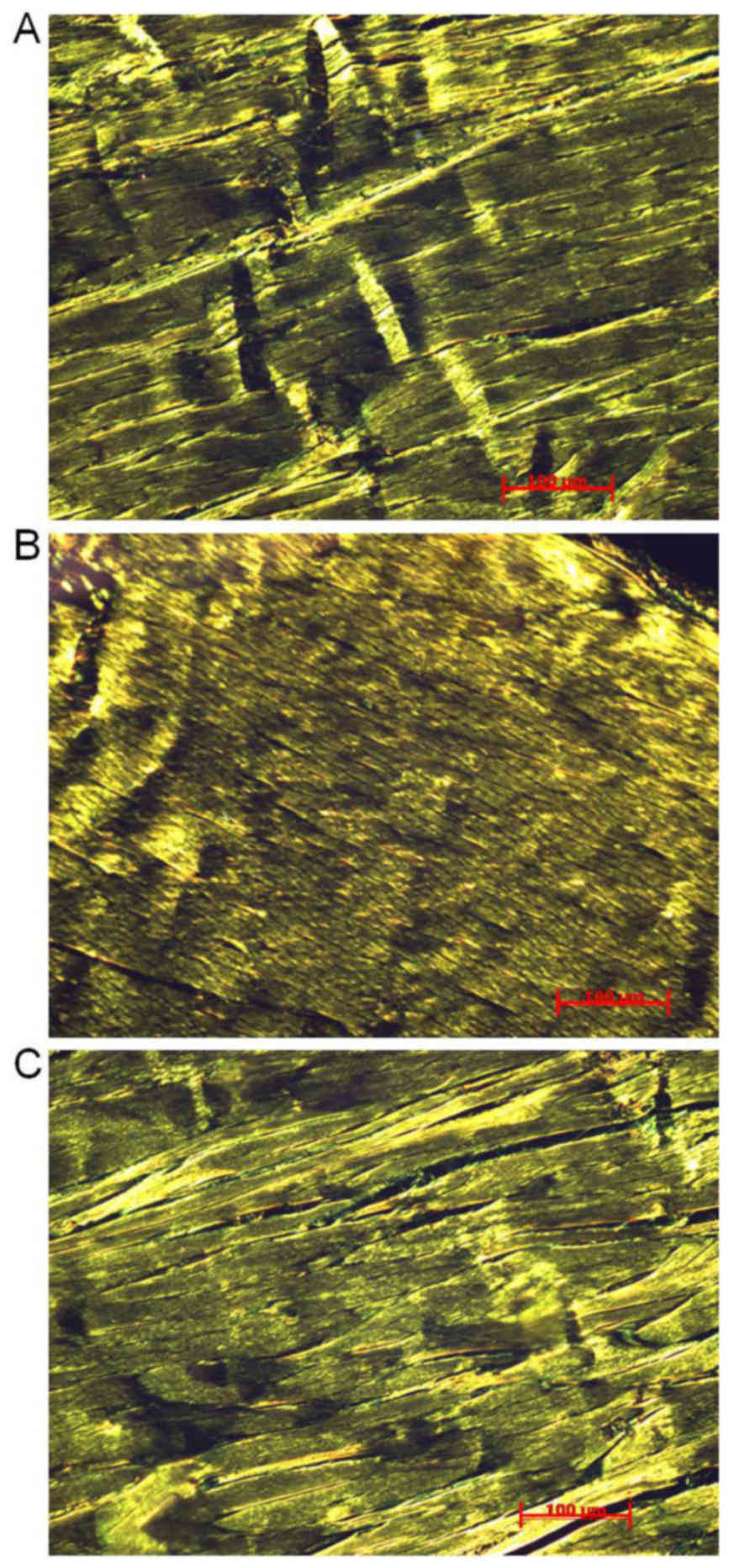 Achilles tendon tissues from each group were obtained by surgery excision for histological staining, fixed in 10% buffered formalin (4°C, overnight) and embedded in paraffin. Samples were cut into 4-mm thick sections, deparaffinized and stained with 5% Picrosirius red to highlight collagen fiber structure and improve its natural birefringence under a polarized light microscope at a magnification ×20 (Axioskop 40 Pol; Carl Zeiss AG, Oberkochen, Germany).