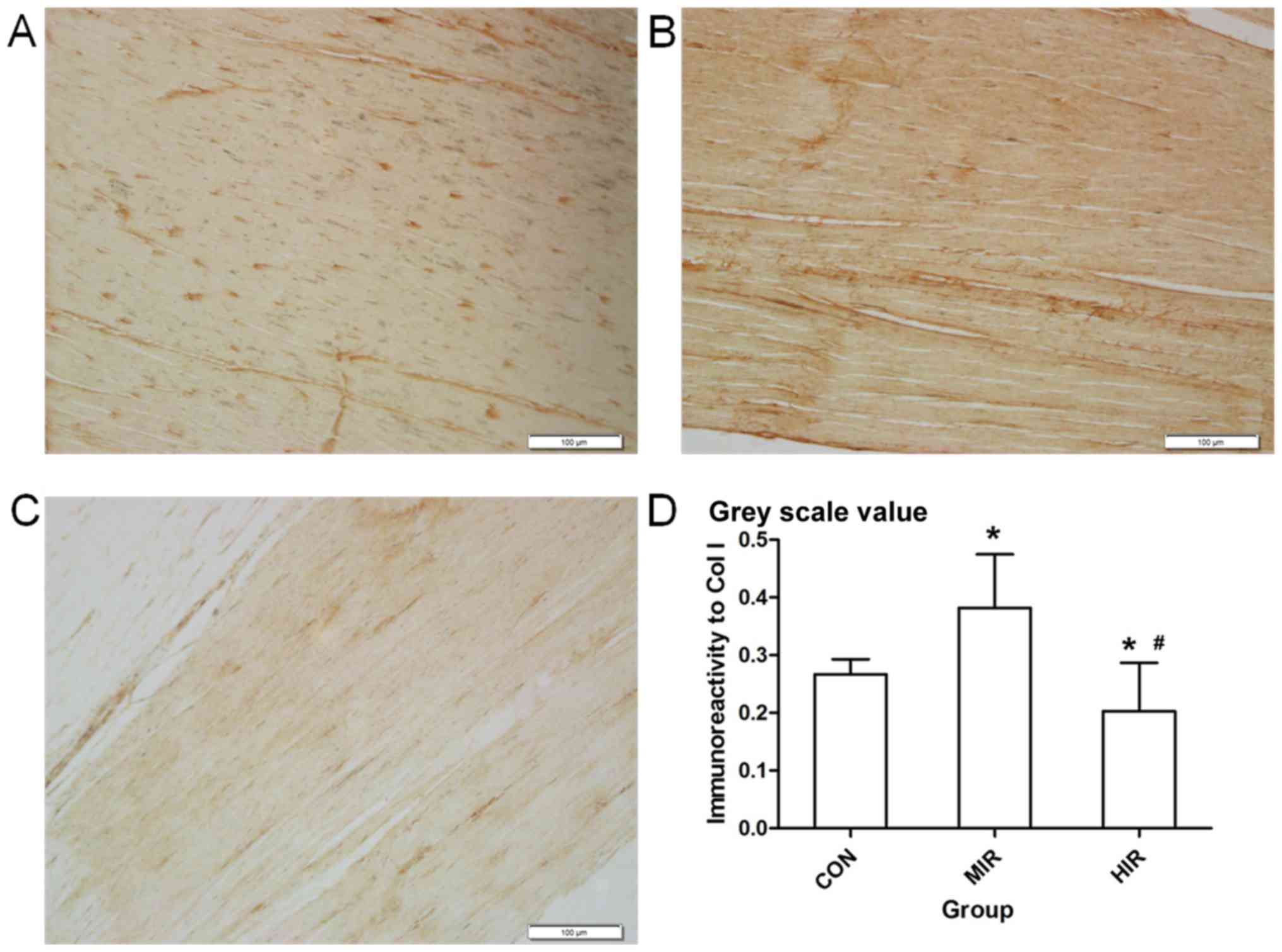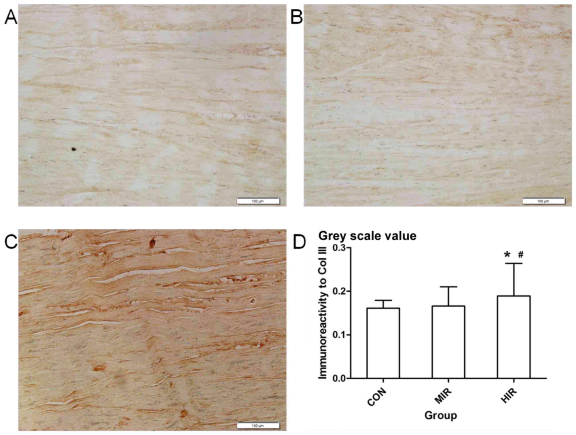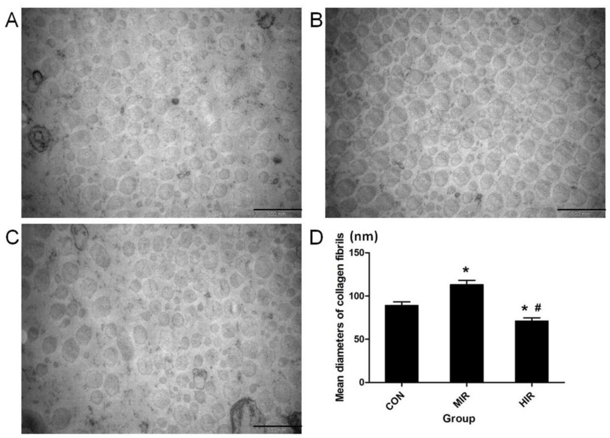 In addition, it should be noted that the level of Col III was increased in the HIR group. Col III has been reported to intercalate into the Col I fibrils and produce smaller, less organized fibrils (24). It was also regarded as an immature collagenous matrix (25). This may in accordance with the results of TEM in the present study, in which more mature and large diameter fibrils were observed in the MIR group but in the HIR group more immature and small diameter fibrils were observed (Fig. 2).