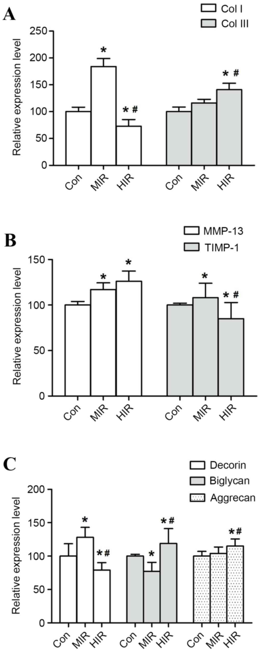 Additionally, decorin expression was significantly higher in MIR group than that in CON group (P=0.034), whereas it was significantly lower in HIR group compared with the CON or MIR groups (P=0.039, P=0.032, respectively; Fig. 5C). Conversely, biglycan expression was significantly lower in MIR group than in the CON group (P=0.022), while significantly higher in the HIR group compared with the CON or MIR groups (P=0.038, P=0.027, respectively; Fig. 5C). Aggrecan expression was significantly higher in the HIR group compared with the CON or MIR groups (P=0.017, P=0.013, respectively). The change in mRNA gene expression of aggrecan was less significant in the MIR group in comparison with the CON group (P=0.073; Fig. 5C).