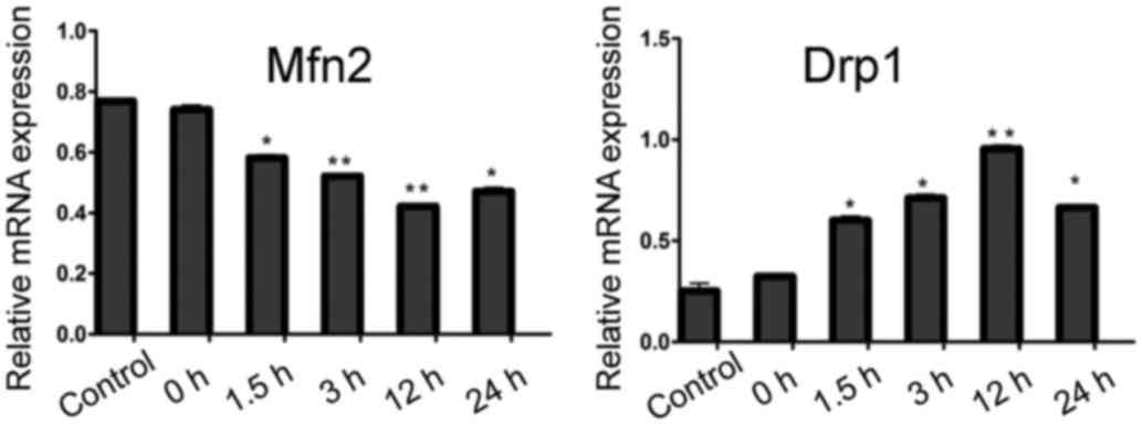 The expression of Mfn2 mRNA in hippocampus tissue was significantly lower than that in the control group at 1.5, 3, 12 and 24 h after recurrent convulsion (p<0.05), whereas that of Drp1 mRNA in hippocampus tissue was distinctly higher than that in the control group at 1.5, 3, 12 and 24 h after recurrent convulsion (p<0.05) (Fig. 2).