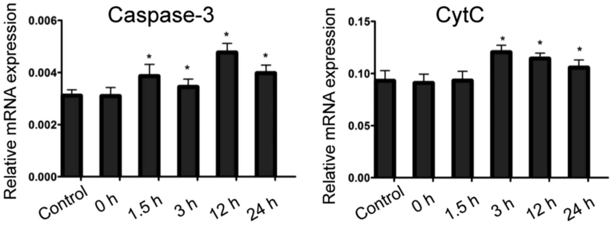 As shown in Fig. 5, the results of western blot analysis revealed that compared with that in the control group, caspase-3 expression in the hippocampus of rats in the convulsion group began to rise at 1.5 h after the last convulsion, and lasted 24 h after convulsion. The expression of Cyt c in hippocampus of rats in convulsion group was increased at 3 h after the last convulsion, and lasted 24 h after convulsion. The results indicated that the expression of apoptosis-related genes, caspase-3 and Cyt c, were increased after the recurrent convulsion during the developmental stage, suggesting that apoptosis occurs in the early stage after recurrent convulsion.