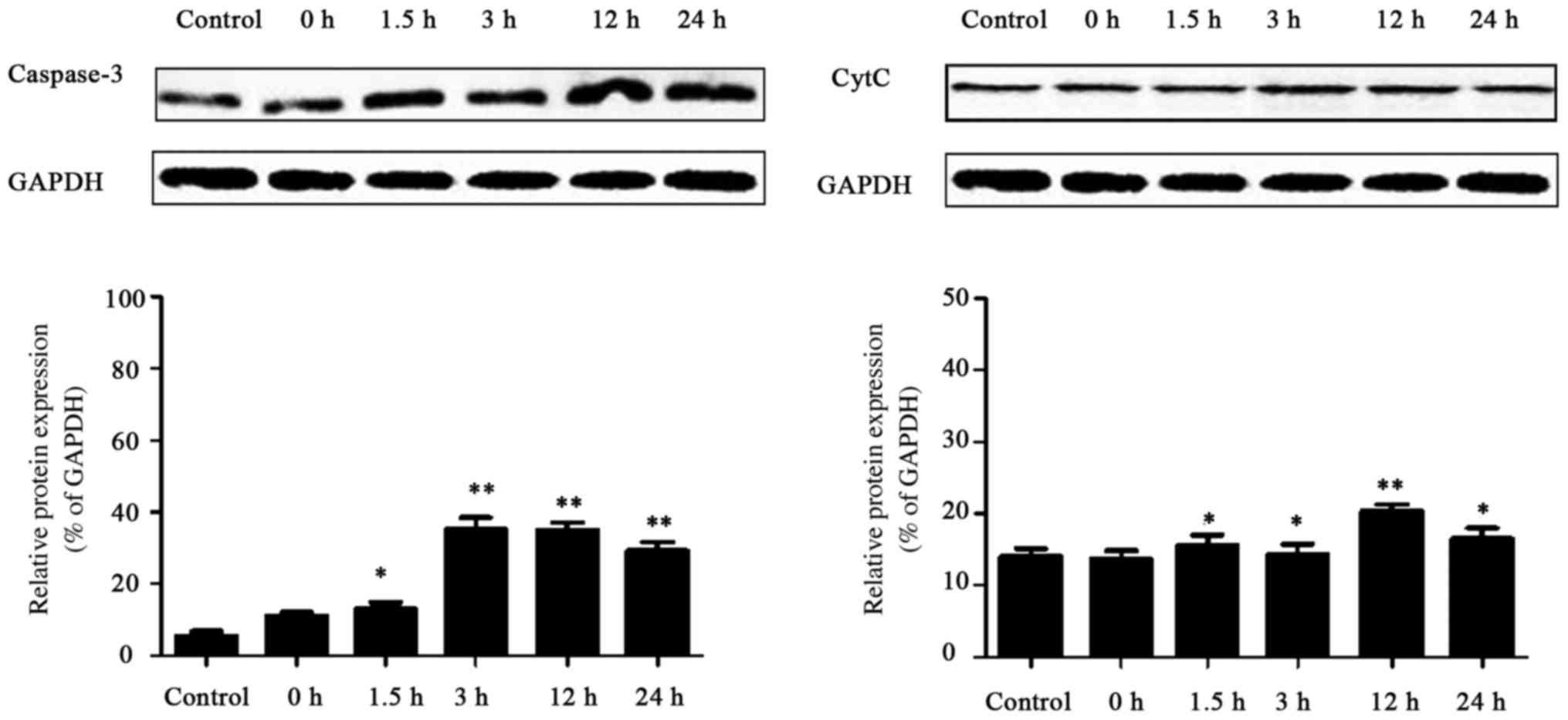 Bicinchoninic acid (BCA) Protein Assay kit (Beyotime Institute of Biotechnology, Shanghai, China); TRIzol Total RNA Extraction kit and reverse transcription-polymerase chain reaction (RT-PCR) kit (both from Tiangen Biotech Co., Ltd., Beijing, China); terminal deoxynucleotidyltransferase (TdT)-mediated dUTP nick end-labeling (TUNEL) kit (Roche, Basel, Switzerland); anti-glyceraldehyde 3-phosphate dehydrogenase (GAPDH), anti-caspase-3 and cytochrome c (Cyt c) monoclonal antibodies and secondary antibodies (all from Cell Signaling Technology, Inc., Boston, MA, USA) were used in the present study.