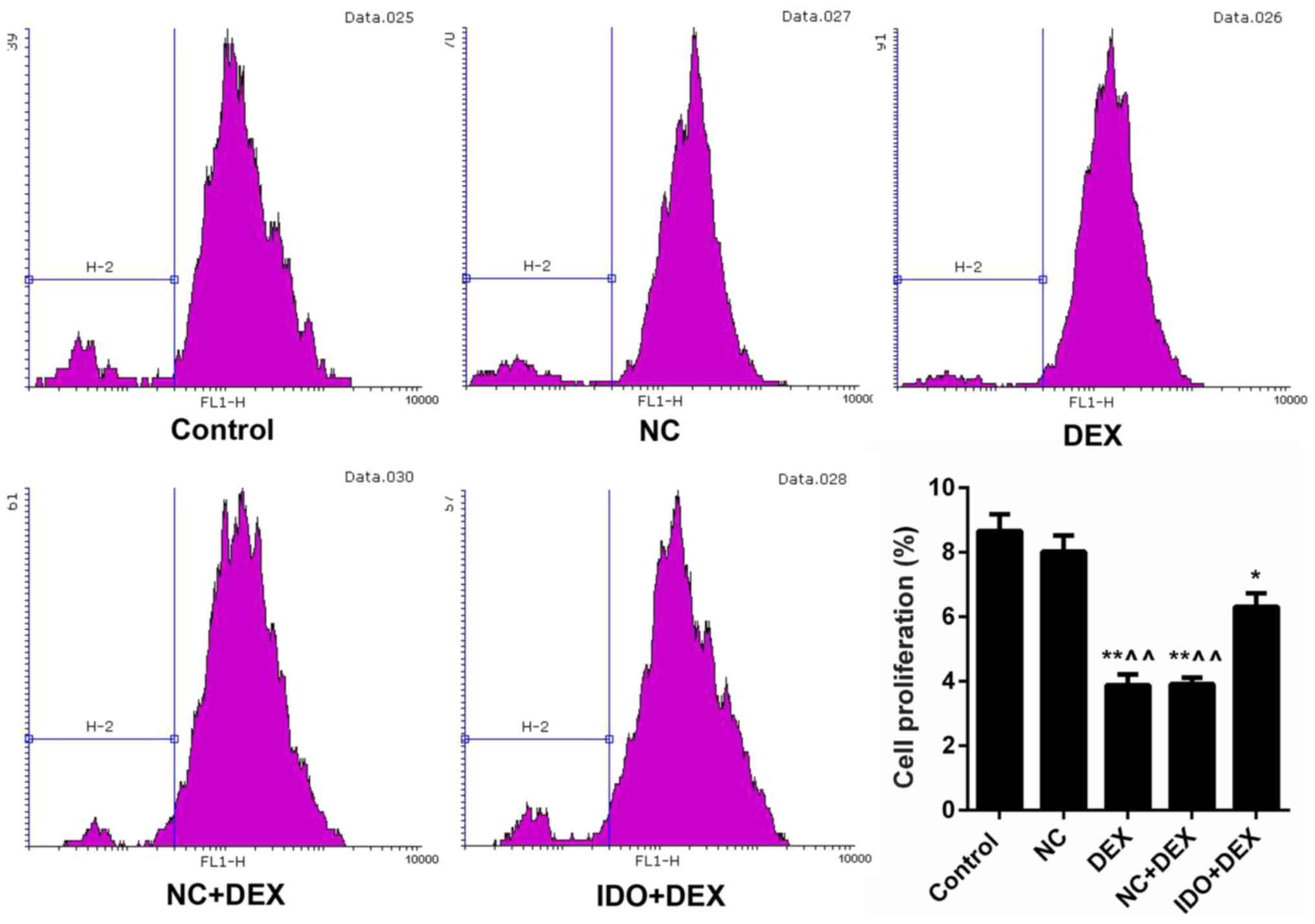 In the current study, it is suggested that the overexpression of IDO is conducive to the repair of human airway epithelial cells inhibited by DEX. According to the previous article, functional IDO expression is high in the lung (47). It has been proved that immature dendritic cells expressing IDO inhibit OVA-induced allergic airway inflammation in vivo (48). In addition, another study has confirmed that knocking down IDO activity markedly decreased the ability of human airway epithelial cells (40). However, the IDO-only treated control group has not been designed in this study. Of course, the addition of the IDO-only treated control group will make the experiment more convincing.