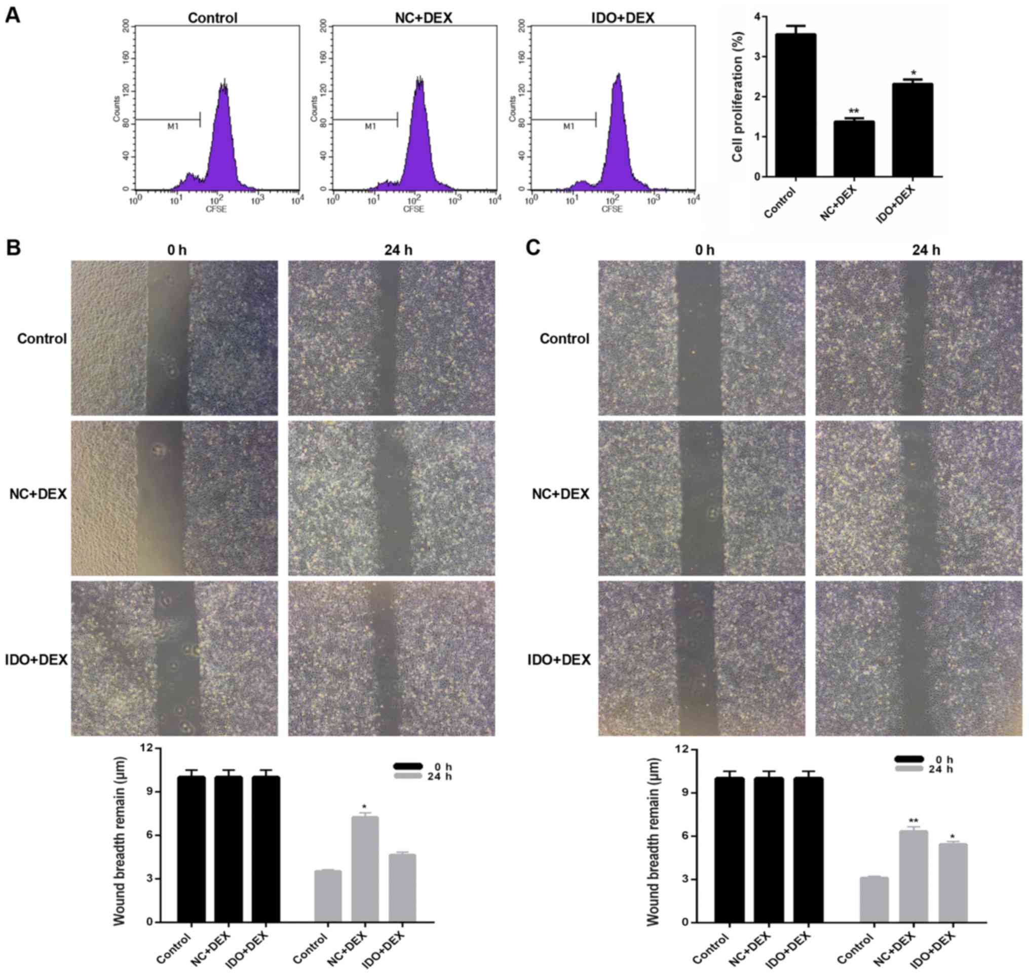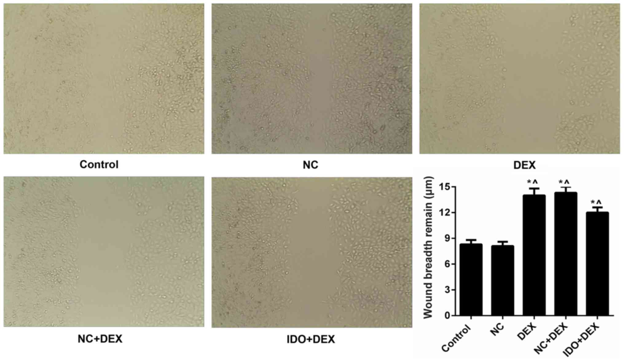 Cultured 16HBE cells were seeded in 24-well plates (about 1×105 cells per well) and treated with control, NC, DEX, or IDO, respectively. Cells were incubated for 15 days until the fusion rate to 100%. Horizontal lines were drawn by a 10 µl pipette tip at the bottom of the 24-well plates through the culture hole. Cells were washed by Hanks liquor three times to remove the crossed cells. The serum-free medium (1% B27, 2 mmol/l glutamine, and 10 µl/ml penicillin-streptonmycin) was added to cells. Cells were maintained in the incubator (37°C, 5% CO2) and pictures were taken using a fluorescence microscope after culturing for 24 or 0 h and 24 h, respectively.