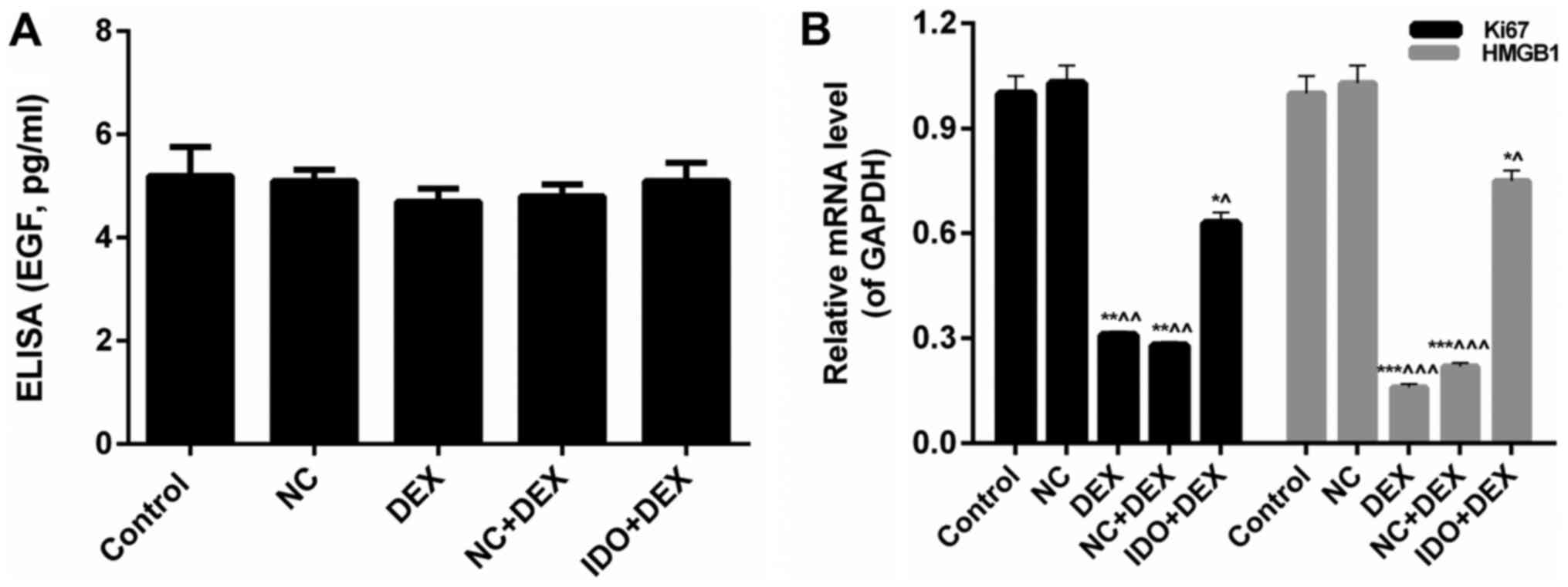 As CFSE labeling results shown in Fig. 2, the cell proliferation rates of 16HBE cells treated with DEX were markedly lower than control (P<0.05). However, after treating with IDO, the cell proliferation rate was distinctly increased (P<0.05; Fig. 2), which indicated that overexpression of IDO enhanced the cell proliferation capacity of 16HBE cells inhibited by DEX. Moreover, we found that DEX obviously restrained the 16HBE cells migration, while IDO evidently remitted the suppression and promoted the cell migration, as assessed by wound-healing assay (P<0.05; Fig. 3). Furthermore, we also evaluated the expression levels of related proliferation- and migration-associated factors in 16 HBE cells in each group. We found that the EGF expression in five treatment groups had no significant differences, which indicated that DEX and overexpression of IDO had little effect on the EGF expression (Fig. 4A). The mRNA expression levels of Ki67 and high-mobility group box 1 protein (HMGB1) were significantly reduced by treating with DEX, while sharp increases were observed in IDO+DEX groups (P<0.05; Fig. 4B). These results revealed that DEX significantly down-regulated the expression levels of Ki67 and HMGB1, while IDO markedly up-regulated the Ki67 and HMGB1 expression. Therefore, we could draw the conclusion that overexpression of IDO promoted the proliferation and migration abilities of 16HBE cells inhibited by DEX through regulating the expression levels of Ki67 and HMGB1, respectively.