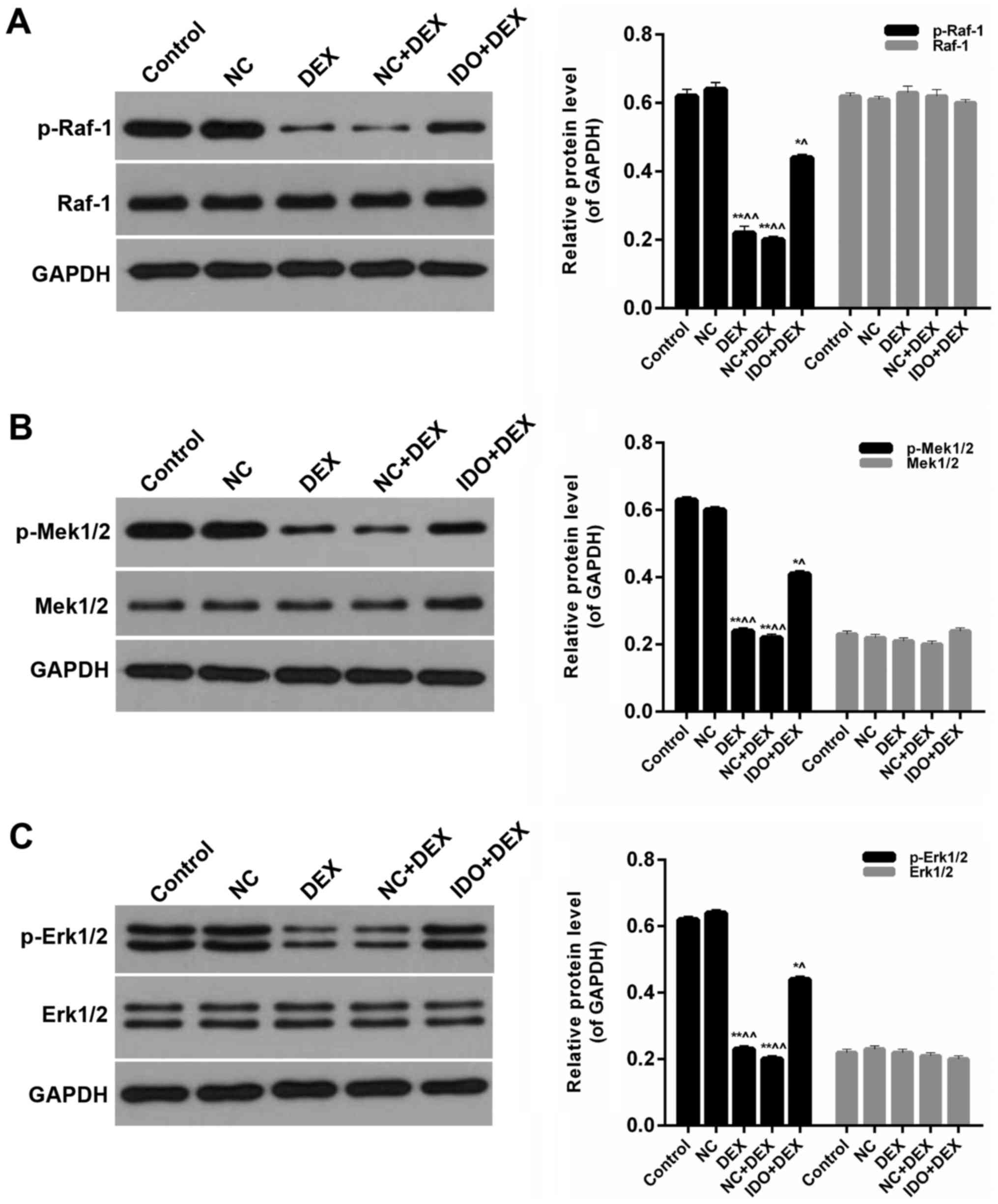 Furthermore, we detected the expression levels of p-Raf-1, Raf-1, p-Mek1/2, Mek1/2, p-Erk1/2, and Erk1/2 in 16 HBE cells from each group. Western blot results indicated that the expression levels of p-Raf-1 in 16HBE cells treated with DEX were significantly lower than control; in the meantime, distinct increases of p-Raf-1 levels were observed in the 16HBE cells treated with IDO (P<0.05; Fig. 5A). However, the expression levels of Raf-1 in five groups had no significant difference (Fig. 5A). The expression levels of p-Mek1/2 in DEX groups were markedly lower than control, while the p-Mek1/2 levels were evidently increased by treating with IDO (P<0.05; Fig. 5B). Nevertheless, the expression levels of Mek1/2 in five groups had no significant difference (Fig. 5B). And compared with control group, the expression levels of p-Erk1/2 were markedly reduced by DEX, while the p-Erk1/2 expression in 16HBE cells treated with IDO was significantly enhanced (P<0.05; Fig. 5C). Besides, the expression levels of Erk1/2 in all of the groups had no significant difference (Fig. 5C). Therefore, it was affirmed that overexpression of IDO affected the MAPK/ERK pathway in the repair of human airway epithelial cells inhibited by DEX.