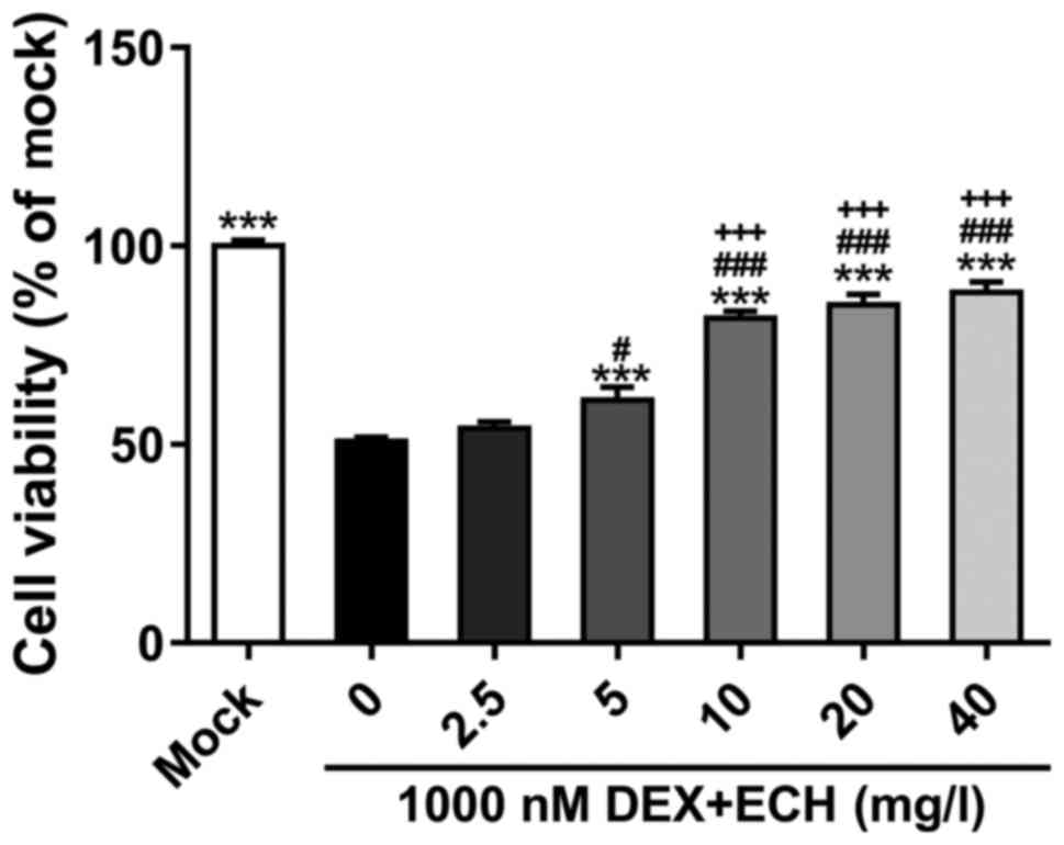 To select the appropriate dose of ECH, treatment of MC3T3-E1 cells was conducted with 1,000 nM of dexamethasone and various doses of ECH (0, 2.5, 5, 10, 20 and 40 mg/l; Shanghai Aladdin Biochemical Technology Co., Ltd., Shanghai, China). Cells grown under normal condition (mock) were served as control. CCK-8 assay was performed after 48 h of culture.