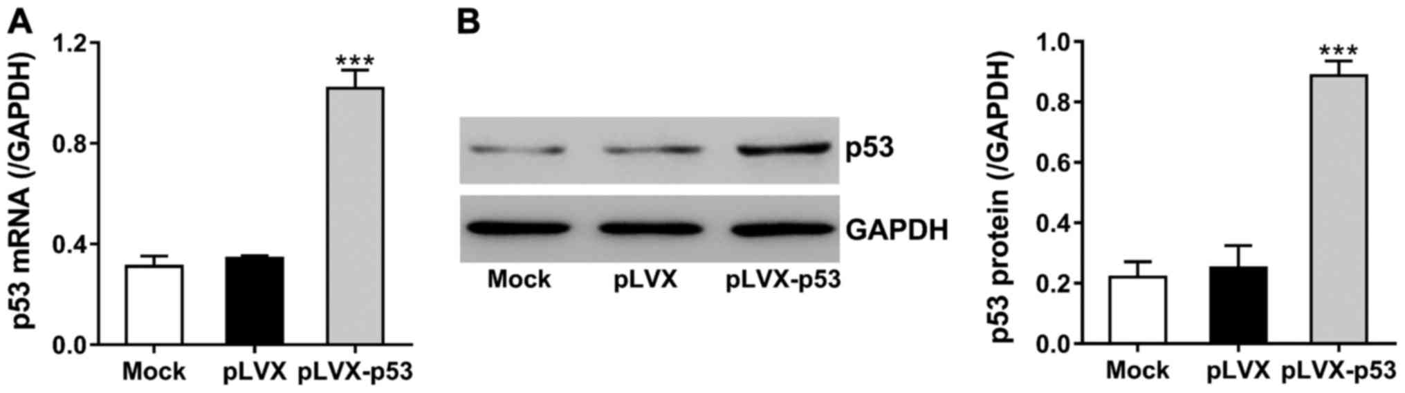 Dexamethasone can upregulate p53, thereby inducing osteoblasts apoptosis (8). To study the effects of ECH on dexamethasone-induced p53 expression, we constructed lentivirus encoding p53 (pLVX-p53) and transduced the virus into MC3T3-E1 cells. The expression of p53 was analyzed at 48 h after transduction. Fig. 3 shows that p53 mRNA and protein levels were increased to >2 times in pLVX-p53-tranduced cells as compared to cells with control virus (pLVX).