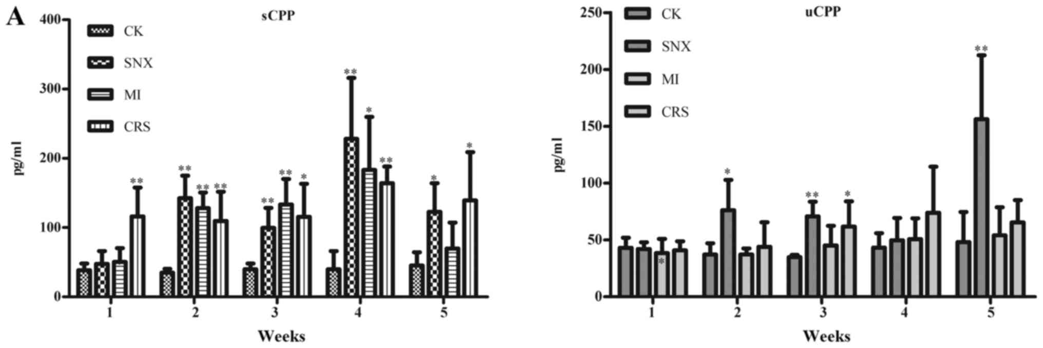 Serum CPP in the SNX group increased significantly in 2–5 weeks after modeling compared with the CK group (P<0.05, P<0.01), and urine CPP increased significantly in 2–3 weeks and 5 weeks after modeling (P<0.05, P<0.01). Serum CPP in the MI group increased significantly in 2–4 weeks after modeling (P<0.05, P<0.01). Serum CPP in the CRS group increased significantly in 1–5 weeks after modeling (P<0.05, P<0.01), and urine CPP increased significantly in 3 weeks after modeling (P<0.05). Meanwhile, compared with the CK group, serum BNP in the SNX group increased significantly in 1–3 weeks after modeling (P<0.05, P<0.01), while urine BNP increased significantly in 4–5 weeks after modeling (P<0.01). Urine BNP in the MI group increased significantly in 1 week, 3–5 weeks after modeling (P<0.05, P<0.01). Serum BNP in the CRS group increased significantly in 1 week and 3 weeks after modeling (P<0.01), while urine BNP increased significantly in 4–5 weeks after modeling (P<0.05; Fig. 3).