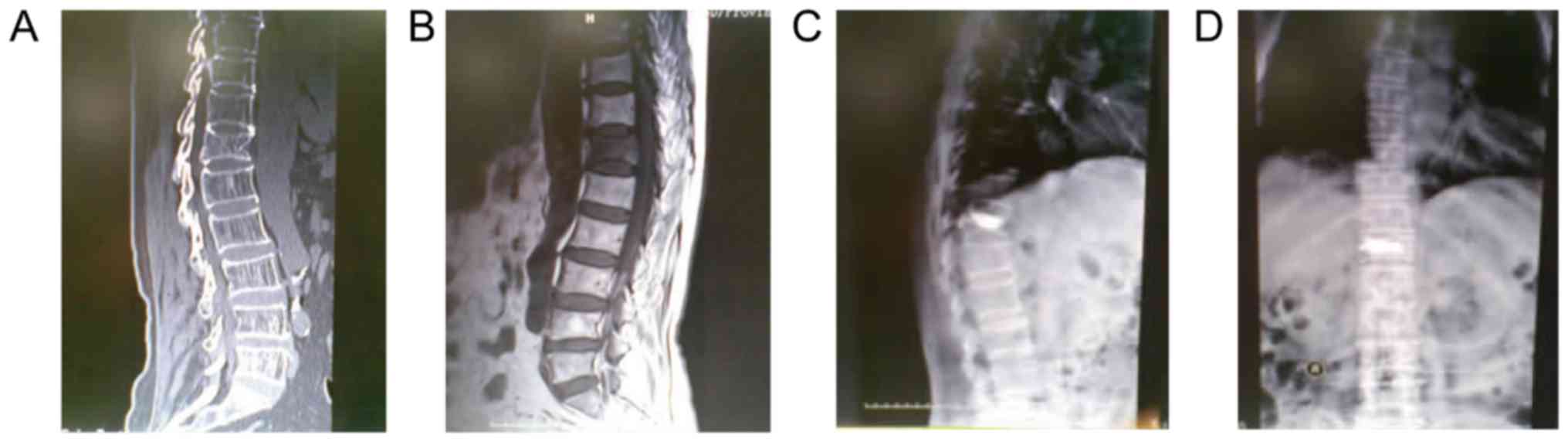 Under local anesthesia, all patients underwent percutaneous kyphoplasty, and during the surgery, patients were required to keep in prone with the hip and anterior superior spine being lifted to keep the abdomen suspended for identify the fracture site of vertebra under X-ray. From the pedicle of vertebral arch in the affected vertebra under local anesthesia, locating pin was guided into the 1/3 site of vertebra, and, after the pathway was expanded manually by a drill, reached to the site 1 cm to the anterior edge of vertebra; again, X-ray examination was then performed to guarantee that the tip of pin was in the midline of vertebra. Thereafter, a saccule was inserted with the pressure being adjusted to 160 to 180 psi, and the vertebra was then slowly opened for injection of about 1 ml of bone cement under X-ray, after which the distribution of bone cement should be closely monitored. At 60 sec later, approximately 1 ml of bone cement was again injected, and the distribution range of bone cement should also be closely monitored to avoid the exosmosis of bone cement to the posterior edge veins of vertebra. In this surgery, the amount of bone cement injection was recorded until the bone cement was coagulated, and surgery was completed after patients kept the prone position for 20 min. After surgery, 10 mg alendronate sodium (SFDA approval no. H10980108; CSPC Huasheng Pharmaceutical Co., Ltd., Shijiazhuang, China) was administrated orally in the morning before meal once per day. Additionally, post-operation X-ray of all patients were done to observe the effections of the operation (Fig. 1C and D). All patients underwent 1-year follow-up. Recurrence of fracture and the site were identified through the clinical symptoms and the results of MRI of spine cord.