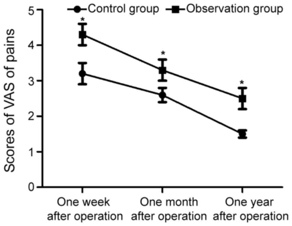 One week, one month and even one year after operation, the scores of VAS of pains in the control group were 3.2±0.3 points, 2.6±0.2 points and 1.5±0.1 points, significantly lower than those of the recurrence patients (4.3±0.3 points, 3.3±0.3 points and 2.5±0.3 points) in the observation group in the same period (t=16.398, 12.279 and 20.000; P<0.05; Fig. 2). It revealed that patients with fracture recurrence after percutaneous kyphoplasty have a much higher pain score.