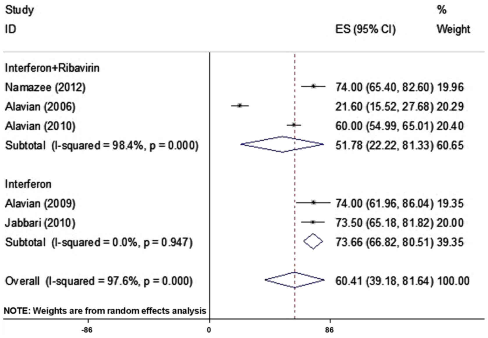 An estimated 185 million individuals worldwide are infected with Hepatitis C virus (1,2). Most of the mortalities associated with hepatitis C virus infection are due to cirrhosis and liver cancer (3). Combination therapy with pegylated interferon-α (peg IFN) and ribavirin is the first line of treatment (4). On average, 55% of patients consistently used these drugs (5). peg IFN in combination with ribavirin is the currently recommended treatment for 70–80% of genotype 2 or 3 and is also used for 40–50% of genotype 1 patients with HCV infection, and conventional interferon were used for other patients (6,7). peg IFN and ribavirin are successful antiviral treatment for numerous adverse effects, including fatigue, mood disorders, anxiety, irritability, emotional lability, agitation, apathy, anhedonia, anorexia, retardation, sleep disturbance, sexual dysfunction and cognitive deficits have been reported during and after the treatment of hepatitis C (8–10). Various studies have reported psychiatric side effects in ~84.5% of patients during treatment with peg IFN and in 42.6% of patients at 6 months after completion of treatment (7,11). In terms of psychiatric side effects, a relatively large body of literature documents high rates of psychiatric symptoms, the definition of which varies between studies, but all of them indicated that IFN induced psychiatric side effects ranging from 30–70% for depression, 39–80% for fatigue, 18–45% for sleep disturbances, 16–50% for irritability, 11–45% for anxiety, 0.0–3.2% for mania, 0.0–0.6% for psychosis, 3.5–10% for suicidal ideation and 0.0–0.2% for suicidal attempts Previous studies have demonstrated that non-specific symptoms occur early and that certain psychiatric side effects may occur following the onset of therapy; most of these events occur after 3 weeks (12,13). These side effects were evaluated in patients treated with peg IFN and ribavirin in order to determine whether it is reasonable to reduce these effects by replacing those drugs. The present meta-analysis study assessed the psychiatric side effects of peg IFN and ribavirin in Iranian patients with chronic hepatitis C infection.