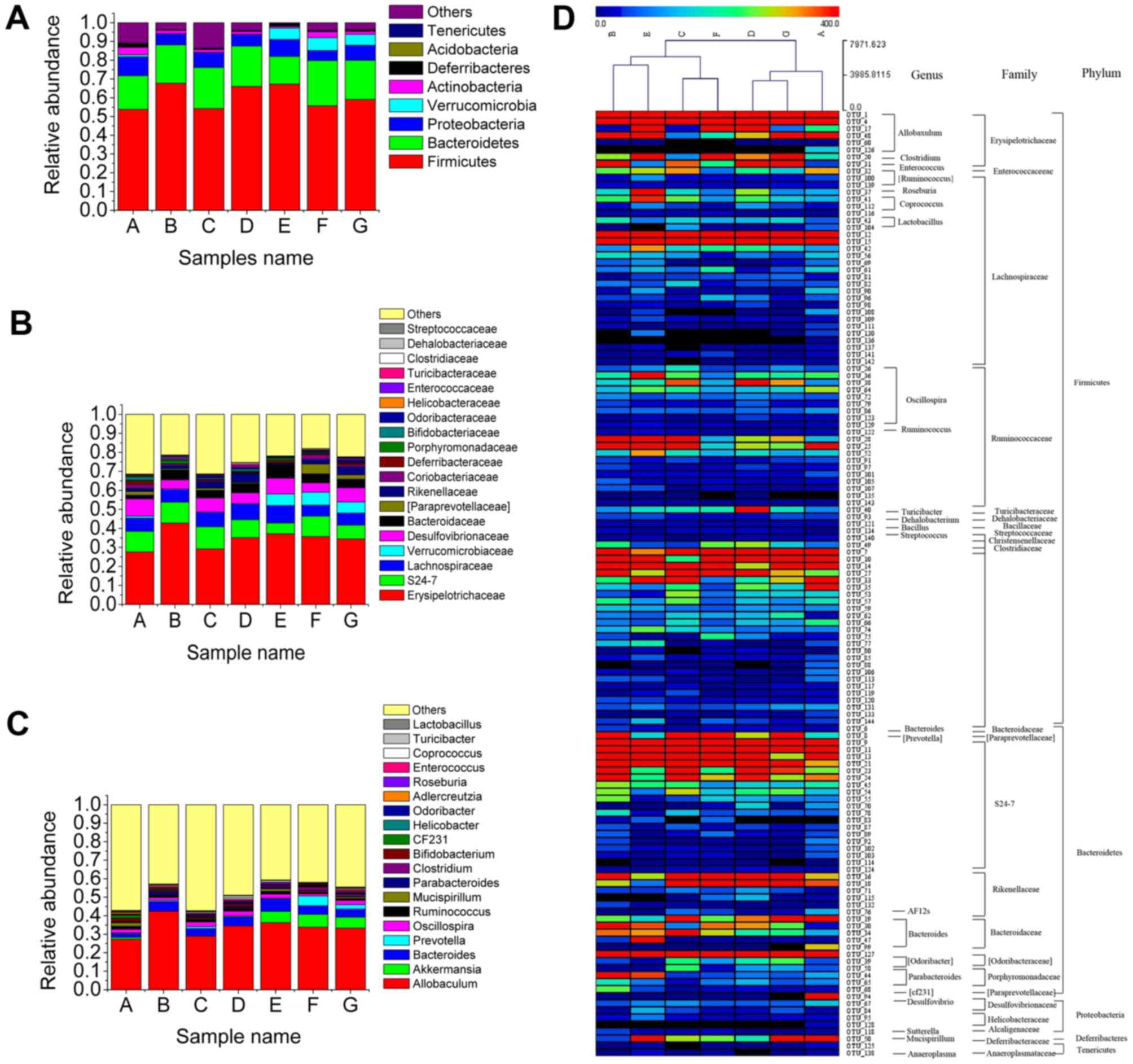Erysipelotrichaceae abundance (42.85%) in mice in Group B was significantly higher compared to that of mice in the control group (27.65%) (Fig. 5B). Several species of Erysipelotrichaceae were identified as potential candidates to play a causal role in the pathogenesis of parenteral nutrition-associated liver injury (PNALI) (28). Moreover, the abundance of Erysipelotrichaceae seemed was affected after treatment with TSG.L, TSG.M, TSG.H (29.20, 35.18, 37.15%), fenofibrate (35.70%), and resveratrol (34.43%). It was also worth mentioning that an MCD diet increased the relative abundance of Helicobacteraceae (0.557%) (Fig. 5B), which was usually considered as pathogenic species (29). Moreover, Helicobacter pylori may activate the inflammasome and caspase-1 in antigen-presenting and other cells, resulting in processing and release of caspase-1-dependent cytokines (30). Mice in groups C, D, E, F and G showed a reduction in the relative abundance of Helicobacteraceae (0.071, 0.065, 0.15, 0.043, and 0.10%, respectively), which suggested that TSG treatment effectively controlled Helicobacteraceae abundance. Mice in groups D, E, F, G, H and I showed increased abundance of Verrucomicrobiaceae (Fig. 5B). It was previously reported that decreased Verrucomicrobia in prediabetes was consistent with the findings by Barlow et al that Akkermansia may play a substantial role in regulating host adiposity and weight loss (31).