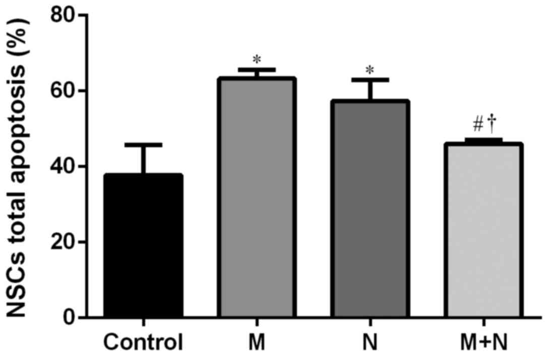 Total apoptosis rates of NSCs in M and N groups increased compared with the control group (P<0.01). Compared with M or N group, the total apoptosis rate of the M+N group decreased (P<0.05). No significant difference was observed between the M and N groups (Figs. 5 and 6). Early stage apoptotic rates of NSCs in M and N groups were revealed to increase compared with the control group (P<0.001). Compared with M and N groups, the early stage apoptotic rate of the M+N group decreased (P<0.001). No significant difference was observed between M and N groups (Fig. 7). Late stage apoptotic rates of NSCs in M and N groups were significantly reduced compared with the control group (P<0.01). Compared with the M and N groups, the late stage apoptotic rate of the M+N group increased (P<0.01). There was no significant difference between the M and N groups (Fig. 8).