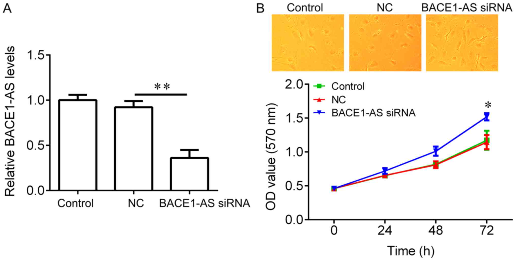 A pregnant SAMP8 mouse (age, 3 months; weight 50 g; n=1; gestational age, 2 weeks) was obtained from the Animal Center of Beijing University Medical Department (Beijing, China) and was fed ad libitum and housed in a 12-h light/dark cycle at 25±1°C and 50% humidity prior to experiments. The mouse was anesthetized with chloral hydrate (40 mg/kg; cat. no. 47335-U; Merck KGaA, Darmstadt, Germany) and 8 embryos were harvested. Primary hippocampal neurons were obtained from embryonic day-15 hippocampi of SAMP8 mice. Briefly, the hippocampi were mechanically removed and cut into 1 mm3 pieces and treated with trypsin and 0.05 mg/ml DNase (cat. no. AMPD1-1KT; Merck KGaA, Darmstadt, Germany) for 15 min at 37°C in serum-free Dulbecco's modified Eagle's medium (DMEM; Gibco; Thermo Fisher Scientific, Inc., Waltham, MA, USA). Hippocampal cells were washed with DMEM containing 10% fetal bovine serum (FBS; Gibco; Thermo Fisher Scientific, Inc.) and resuspended in completed culture medium [DMEM supplemented with 10% FBS, penicillin (50 U/ml), streptomycin (50 U/ml) and glutamine (0.5 mmol/l)]. The cells were cultured in a humidified atmosphere containing 5% CO2 at 37°C. To knockdown BACE1-AS in primary hippocampal neurons, the cells were infected with BACE1-AS siRNA lentivirus (10×107 titer units/ml) using Lipofectamine 2000 (Invitrogen; Thermo Fisher Scientific, Inc.) for 48 h at 37°C. After 72 h, cells were photographed using light microscopy (magnification, ×100) to observe morphological alterations.