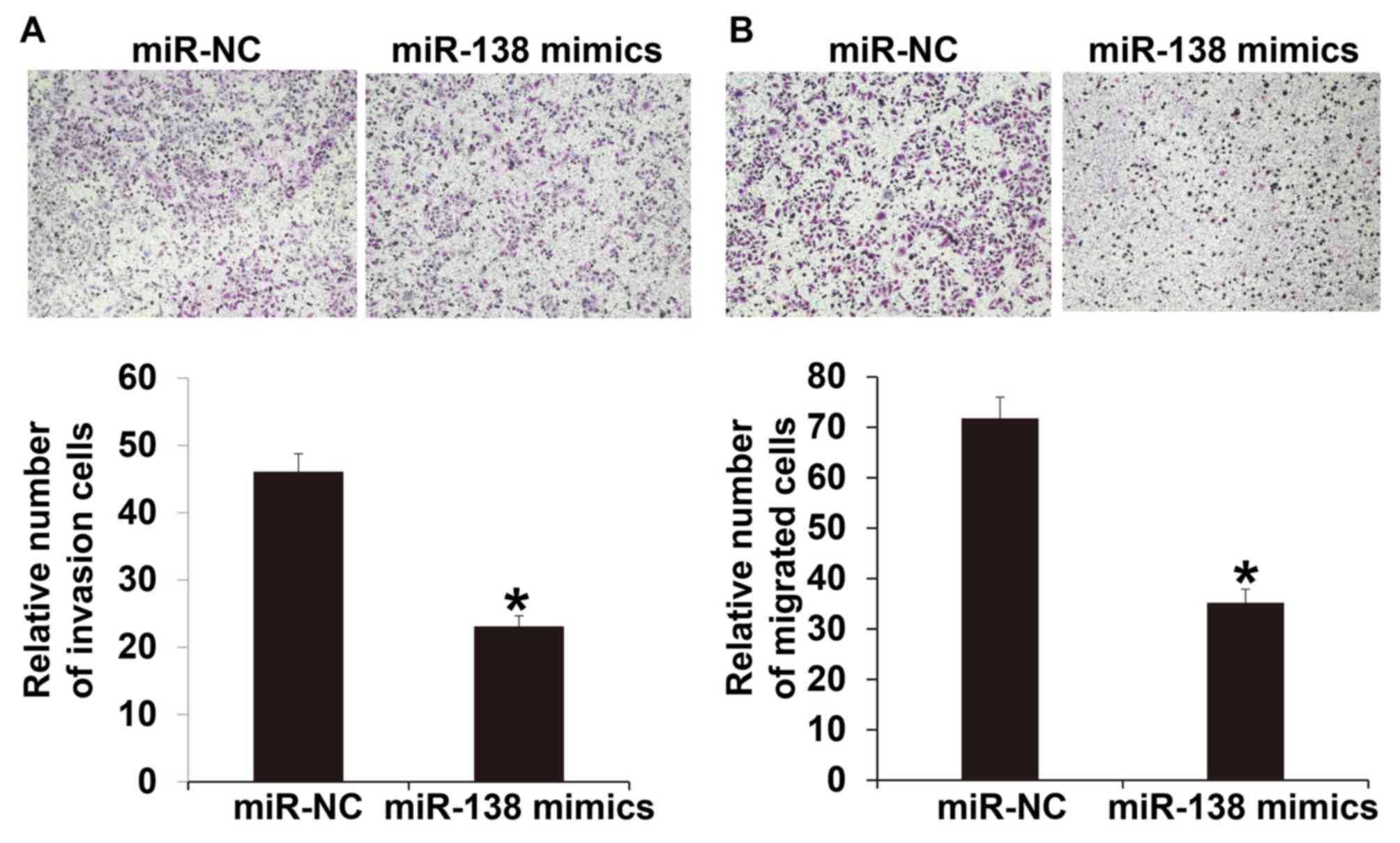 To investigate the invasion and migration abilities of A2780 cells, Transwell assays were used. The invasion assay indicated that the number of cells that crossed the Transwell membrane in the miR-138 mimic group was significantly lower compared with the miR-NC group (P<0.05; Fig. 4A). Similarly, the migration assay indicated that the number of cells that crossed the Transwell membrane in the miR-138 mimics group was significantly reduced compared with the miR-NC group (P<0.05; Fig. 4B). These results suggest that miR-138 suppresses the invasion and migration of A2780 cells.
