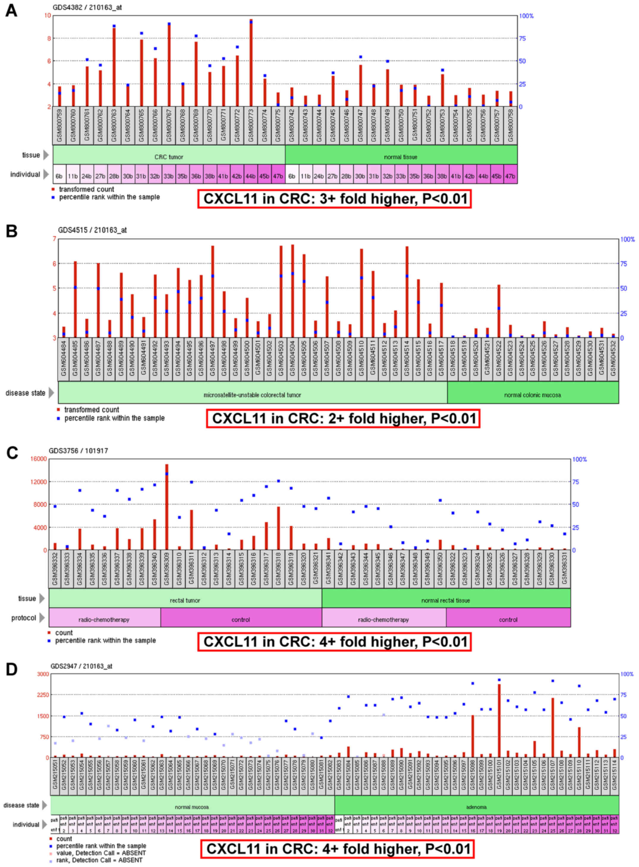 To measure the expression of CXCL11 in CRC tissues, microarray datasets GDS4382, GDS4515, GDS3756 and GDS2947 were downloaded from GEO DataSets. The mean values of CXCL11 in CRC tissues were 3+fold higher compared with normal tissues (Fig. 1A); in microsatellite-unstable colorectal tumor tissues they were 2+fold higher compared with normal colonic mucosa tissues (Fig. 1B); in rectal tumor tissues they were 4+fold higher compared with normal rectal tissues (Fig. 1C); and in adenoma tissues they were 4+fold higher compared with normal mucosa tissues (Fig. 1D). All the above mentioned data supported the upregulation of CXCL11 in CRC tissues.