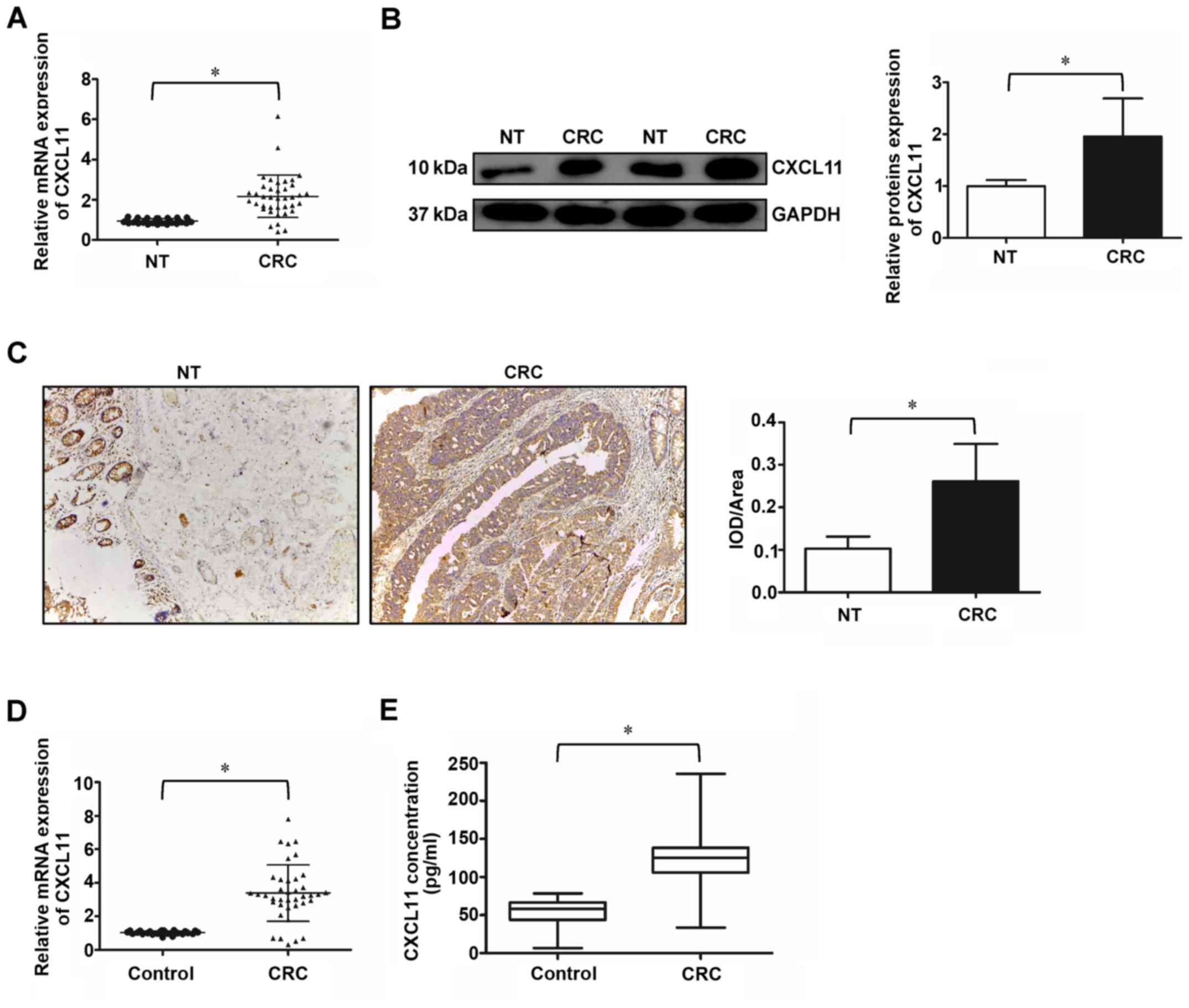RT-qPCR was used to determine the levels of CXCL11 mRNA in tumor tissue and serum samples; western blotting and immunohistochemistry were used to detect the expression and localization of the CXCL11 protein in tumor tissue samples; ELISA was conducted to measure the concentration of the CXCL11 protein in serum samples. The data revealed that the levels of CXCL11 mRNA were significantly upregulated in CRC tissues (2+fold higher, P<0.05; Fig. 2A) and serum samples (3+fold higher, P<0.05; Fig. 2D) collected from CRC patients. Upregulation of the CXCL11 protein was detected in CRC tissues (Fig. 2B and C) and the localization of CXCL11 was in the cytoplasm and on the cell membrane (Fig. 2C). Increased expression of the CXCL11 protein was also found in serum samples from patients with CRC (Fig. 2E). The expression trend of CXCL11 in clinical specimens was similar to our bioinformatics analysis, indicating that increased CXCL11 expression may be implicated in CRC.