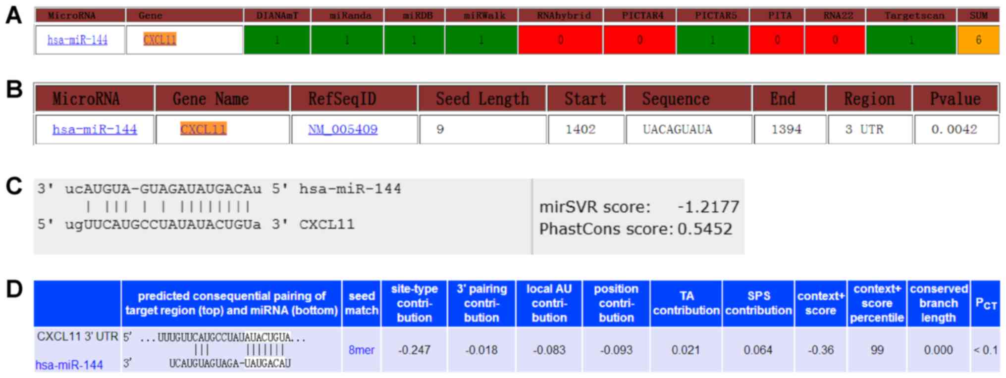 To search for the potential regulator of CXCL11, miRWalk was used for the bioinformatics predictions. Of the 10 the established miRNA-target prediction programs, 6 predicted that CXCL11 was a potential target of miR-144 (Fig. 3A). The miR-144 target site in the CXCL11 mRNA 3′UTR was shown in some programs (Fig. 3B-D).