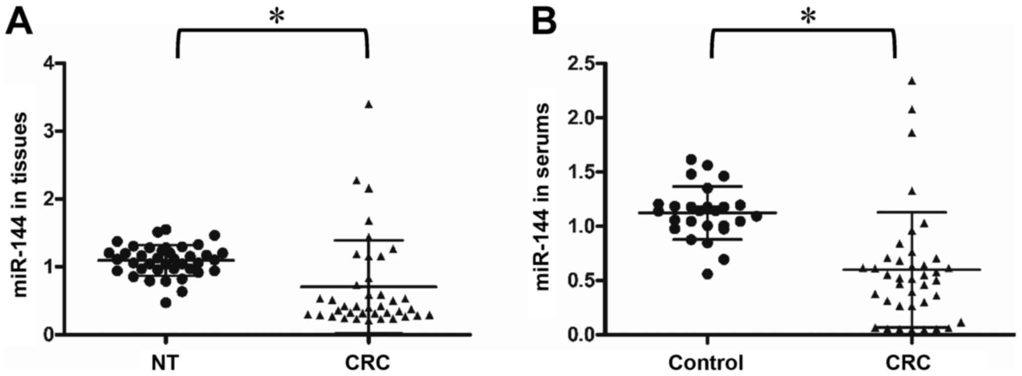 The objective of the present study was to elucidate the role of miR-144 and CXCL11 in CRC progression. We reported the levels of CXCL11 in clinical specimens obtained from CRC patients. Then, using bioinformatics analysis, we found that miR-144 is a potential regulator of CXCL11. Next, we detected the expression of miR-144 in the serum and tumor tissues of CRC patients. Finally, luciferase assay verified that miR-144 directly targeted the 3′-UTR of CXCL11 mRNA.