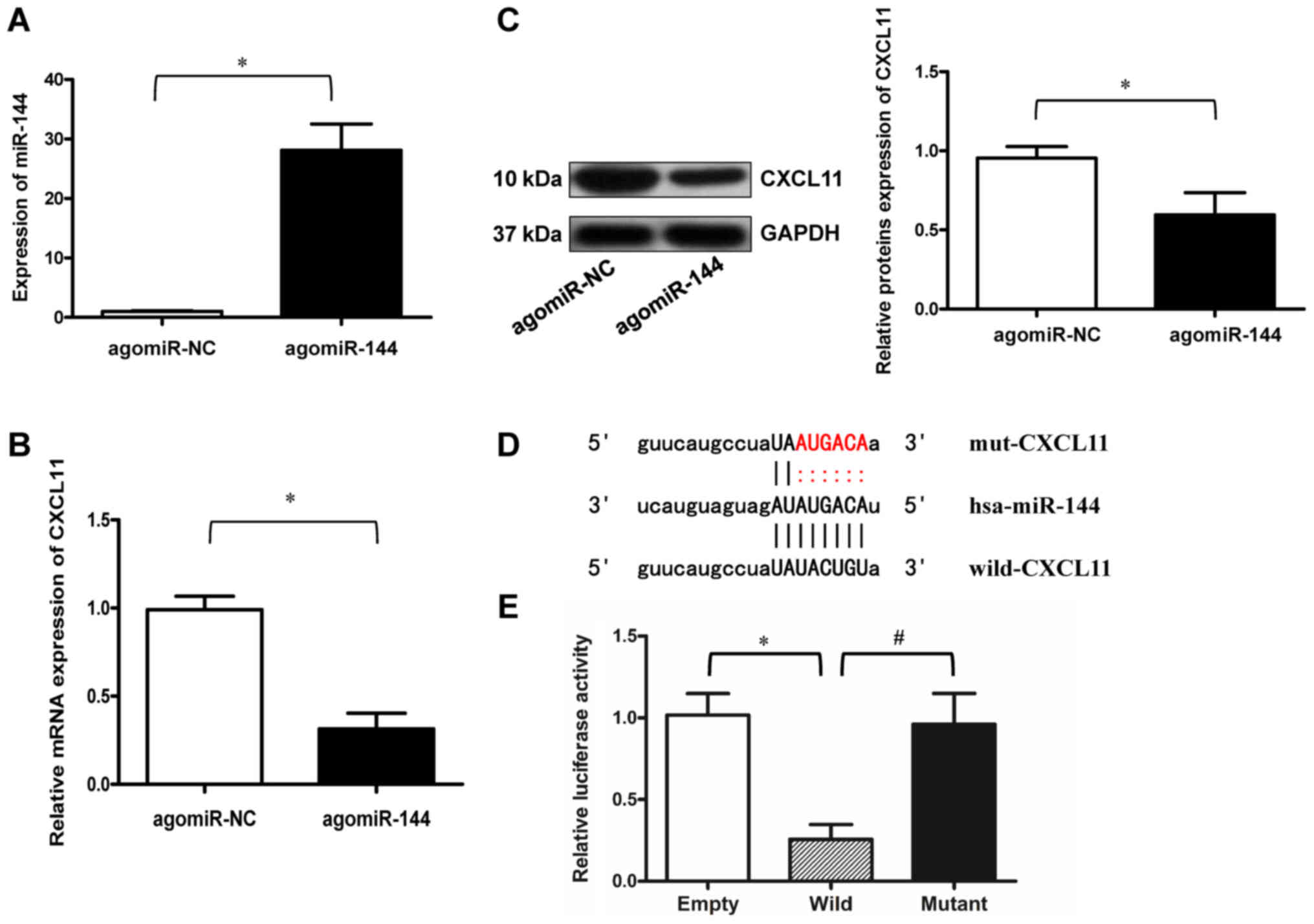 According to the bioinformatics analysis results, a fragment of the CXCL11 3′-untranslated region (UTR) containing the wild type (WT) or mutant (MT) seed regions of miR-144 was chemically synthesized in vitro. The products were inserted into Spe-1 and Hind III restriction sites of pMIR-REPORT luciferase reporter plasmids (Ambion; Thermo Fisher Scientific, Inc.). The constructs were co-transfected with agomiR-144 into 293T cells using ExFect® Transfection Reagent (Vazyme Biotech Co., Ltd.); the empty plasmid was set as control. After 48 h of transfection, the cells were harvested. The luciferase activity was measured using a dual-luciferase reporter assay kit (Promega Corporation, Madison, WI, USA) and GloMax 20/20 luminometer (Promega Corporation). All the procedures were performed according to the manufacturer's instructions.