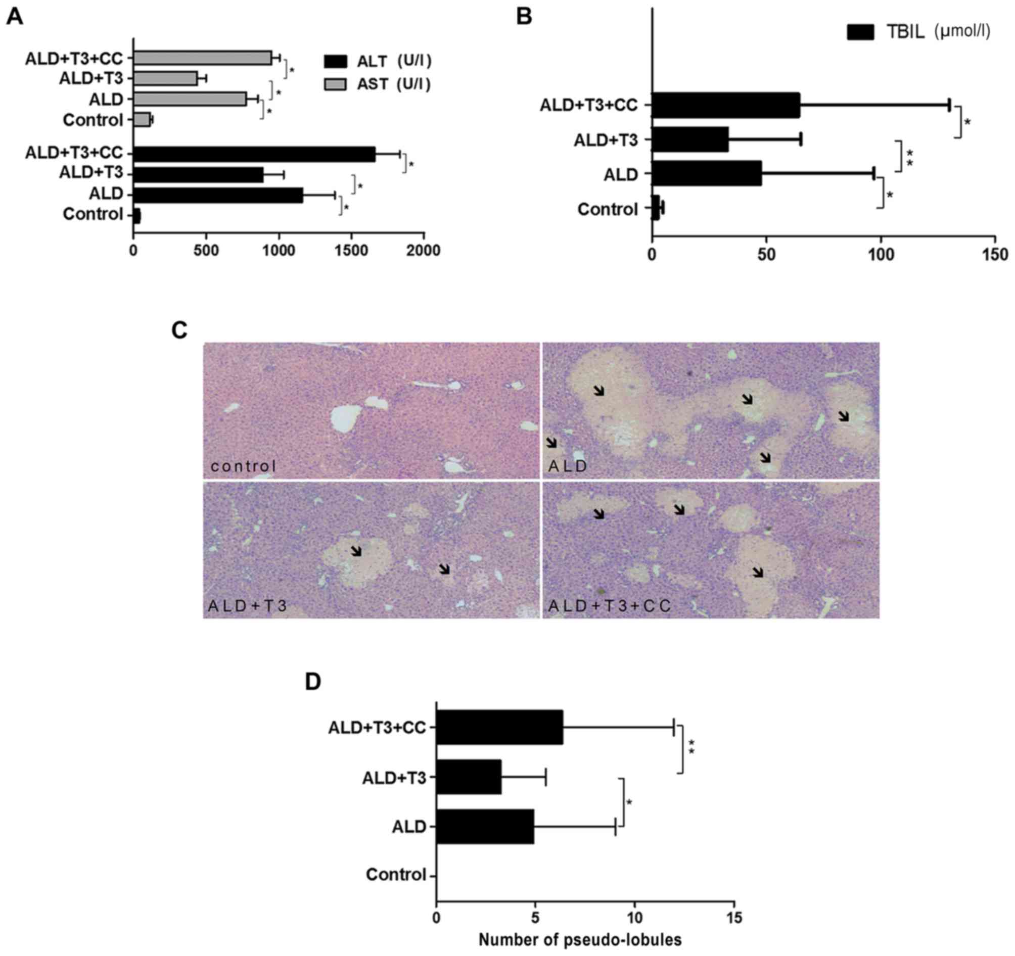 The results demonstrated that serum ALT/AST (Fig. 2A) and TBIL (Fig. 2B) levels in the ALD+T3 group were significantly reduced compared with those in the ALD group (P<0.05), whereas ALT/AST levels in the ALD+T3+CC group were significantly increased compared with those in the ALD+T3 group (P<0.05). These results suggest that T3 may effectively reduce the levels of liver enzymes and bilirubin in mice with alcoholic cirrhosis and have a significant protective effect on the liver.