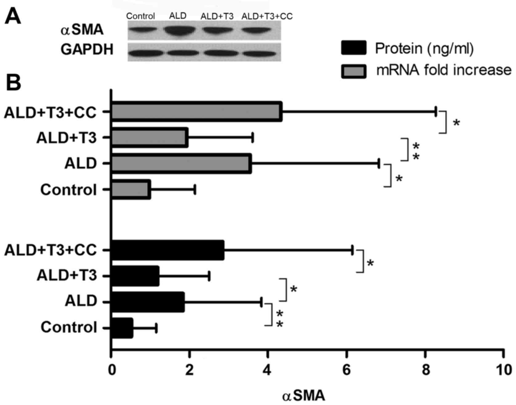 Previous studies have demonstrated that the occurrence and development of liver cirrhosis is associated with the activation of hepatic stellate cells (21), which results in colloid and deposition. A key marker of hepatic stellate cell activation is the production of α-SMA (22). In the present study, western blotting revealed that the expression of α-SMA protein in the ALD+T3 group was significantly decreased compared with the ALD group (P<0.05); however, it was significantly increased in the ALD+T3+CC group compared with the ALD+T3 group (P<0.05; Fig. 4). These results suggest that T3 may effectively reduce the α-SMA content in the liver tissues of mice with alcoholic cirrhosis. It was also revealed that the level of α-SMA mRNA was significantly decreased in the ALD+T3 group compared with the ALD group (P<0.01), whereas it was significantly increased in the ALD+T3+CC group compared with the ALD+T3 group (P<0.05). These results reveal that T3 significantly reduces the expression of α-SMA mRNA and protein in ALD mice and alleviates the severity of liver cirrhosis.