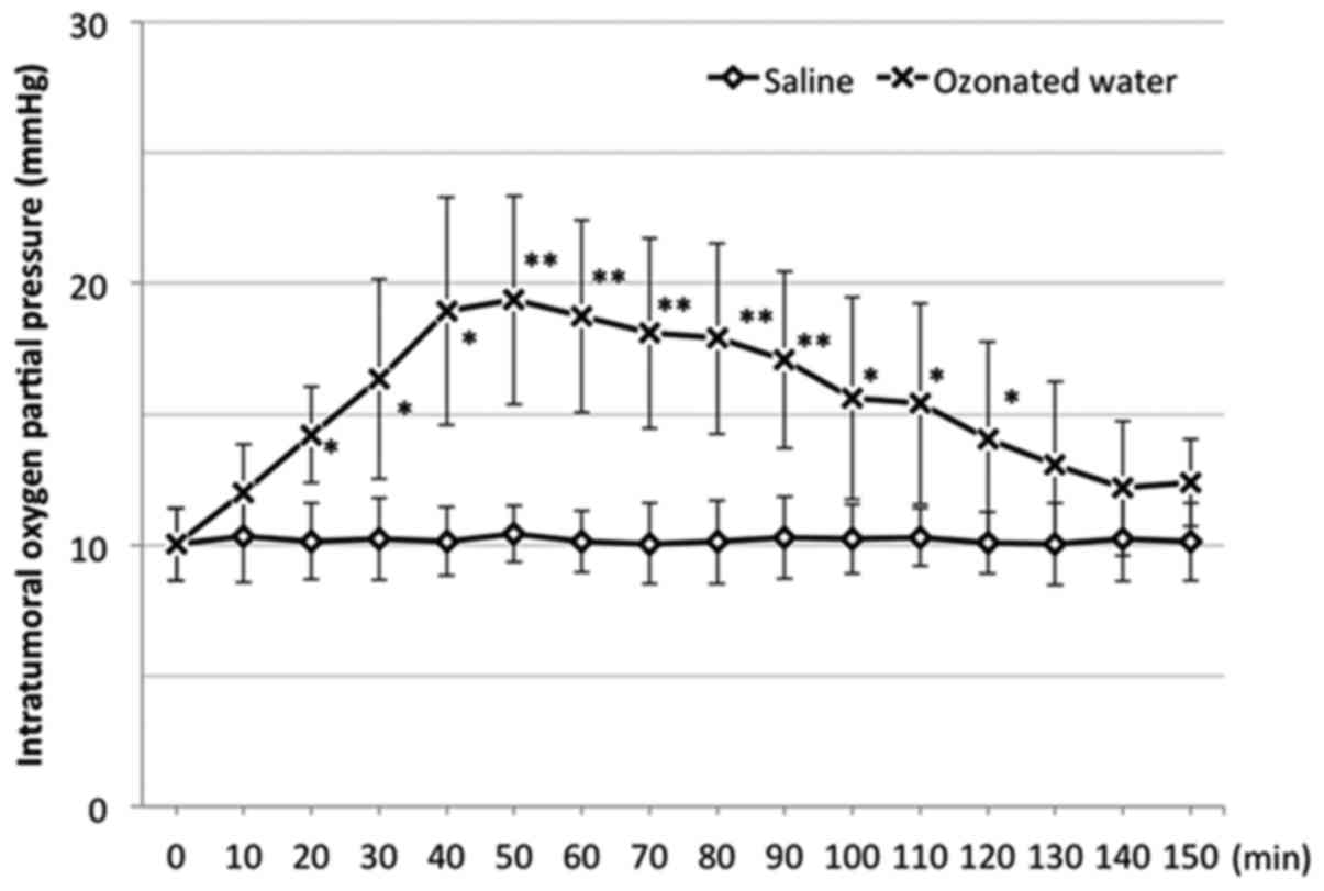 Mice were randomized into two groups: Sterile saline (S) group and ozonated water (O3) group (n=5 per group). Oxygen and indifferent electrodes (Bio Research Co., Nagoya, Japan) were inserted into the center of the tumor. After intraperitoneal administration of sterile saline or ozonated water (0.2 ml/head), intratumoral oxygen partial pressure was measured by polarography (Bio Research Co.), every 10 min immediately after administration up to 150 min.