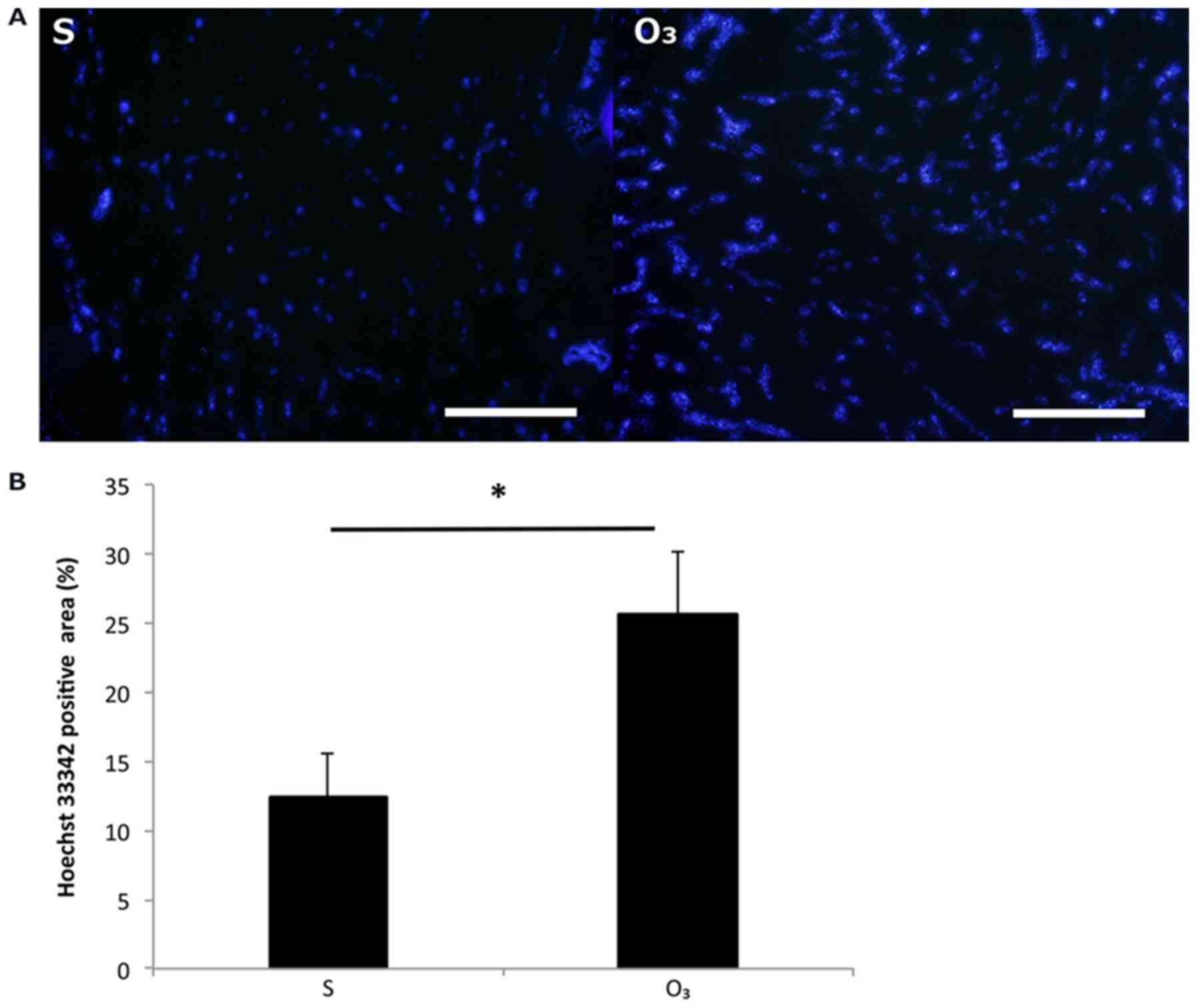 The intratumoral blood perfusion in the O3 group increased compared to that in the S group (Fig. 2). The H33342-positive area was 12.3±3.2% in the S group and 25.6±4.6% in the O3 group. There was a significant difference between the two groups (P<0.05).