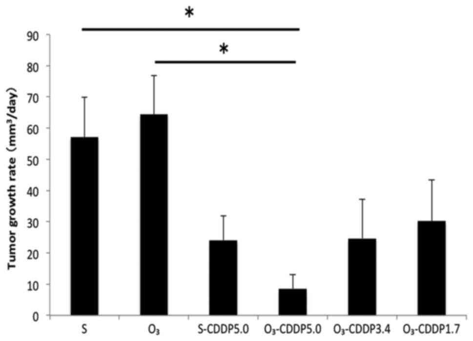 Tumor growth was significantly suppressed in the O3-CDDP5.0 group compared to that in the S and O3 groups (P<0.05) (Fig. 3). A statistically significant difference was not observed between the S-CDDP5.0 and O3-CDDP5.0 groups. However, tumor growth in the O3-CDDP5.0 group tended to be suppressed, compared to that in the S-CDDP5.0 group. In the O3-CDDP3.4 group, despite reducing the concentration of the antitumor drug, tumor growth suppression was observed, which was comparable to that observed in the S-CDDP group.