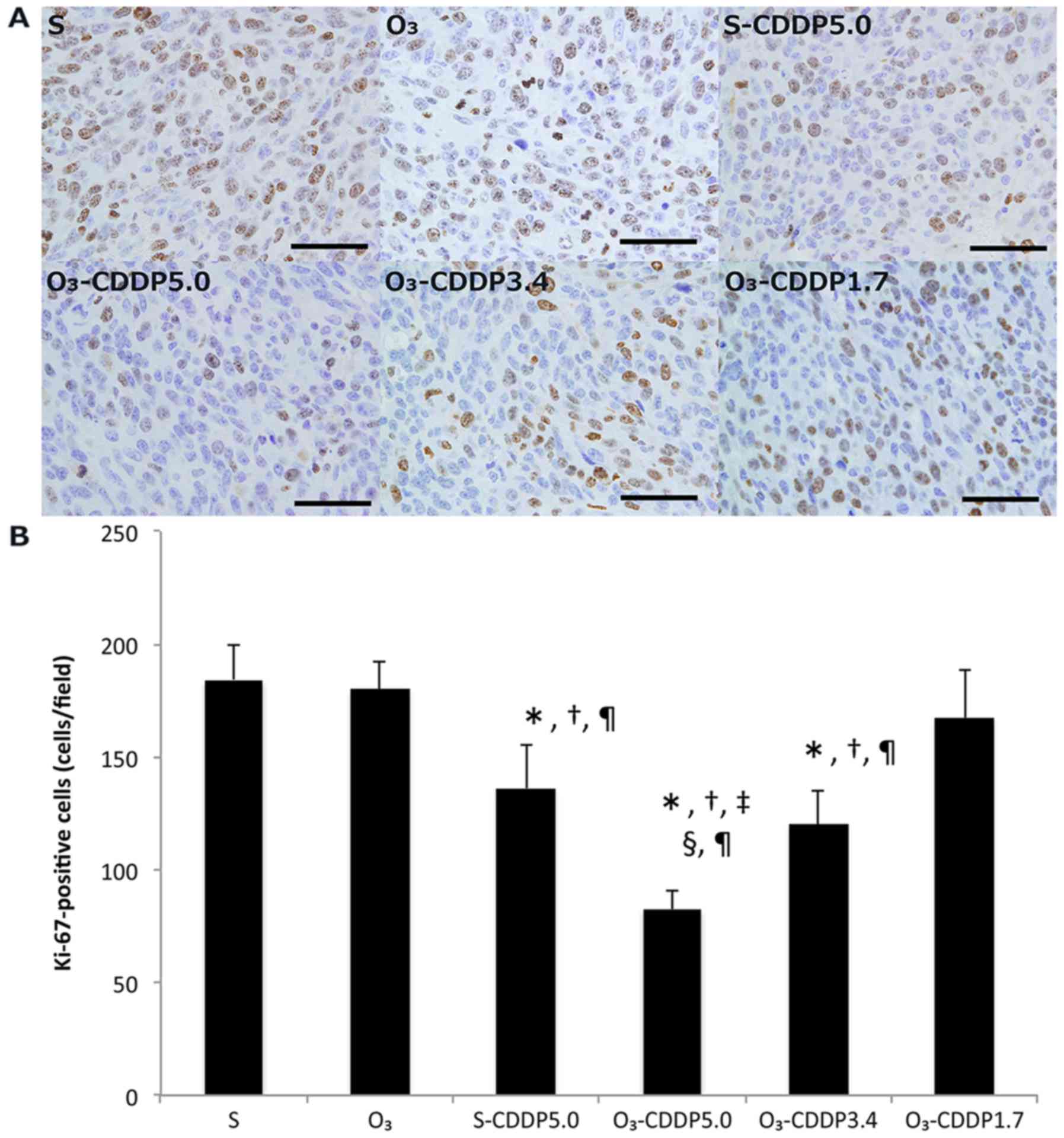 In the O3-CDDP5.0 group, the number of Ki-67-positive cells significantly decreased, compared to that in the other groups (Fig. 4). The number of Ki-67-positive cells in the O3-CDDP3.4 and S-CDDP groups significantly decreased, compared to that in the S, O3, and O3-CDDP1.7 groups. There was no statistically significant difference between the S-CDDP5.0 and O3-CDDP3.4 groups.