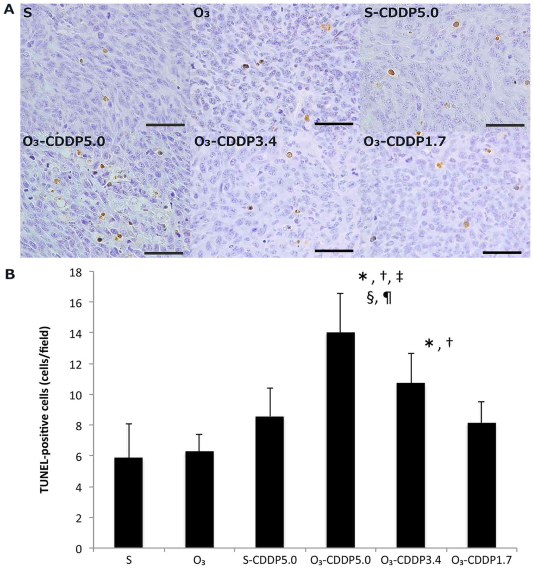 In the O3-CDDP5.0 group, the number of TUNEL-positive cells significantly increased, compared to that of the other groups (Fig. 5). The number of TUNEL-positive cells in the O3-CDDP3.4 group significantly increased, compared to that in the S and O3 groups. No statistically significant difference was observed among the S-CDDP5.0, O3-CDDP3.4, and O3-CDDP1.7 groups.