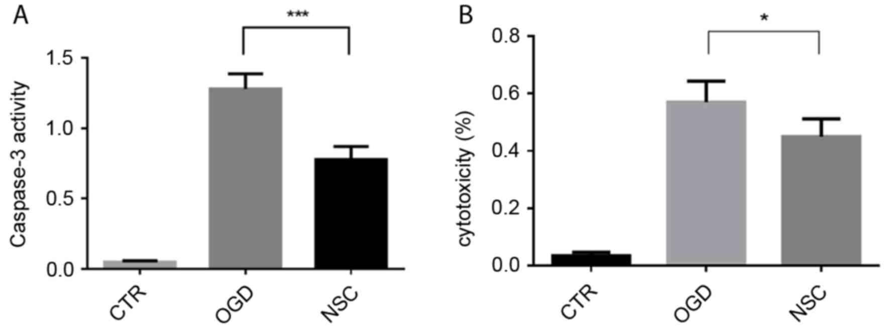 Caspase-3 activation serves a key role in apoptosis and may be used as a marker of apoptosis. Caspase-3 activity was increased ~1.4-fold in the OGD group compared with the NSC group (P<0.001; Fig. 1A). LDH is an indicator of cytotoxicity, which is released into the cell culture supernatant when cell membranes are damaged. The effect of NSCs on OGD-induced BMEC cytotoxicity was evaluated using an LDH release assay (Fig. 1B). The cytotoxicity of the NSC group was significantly decreased compared with the OGD group (P<0.05).