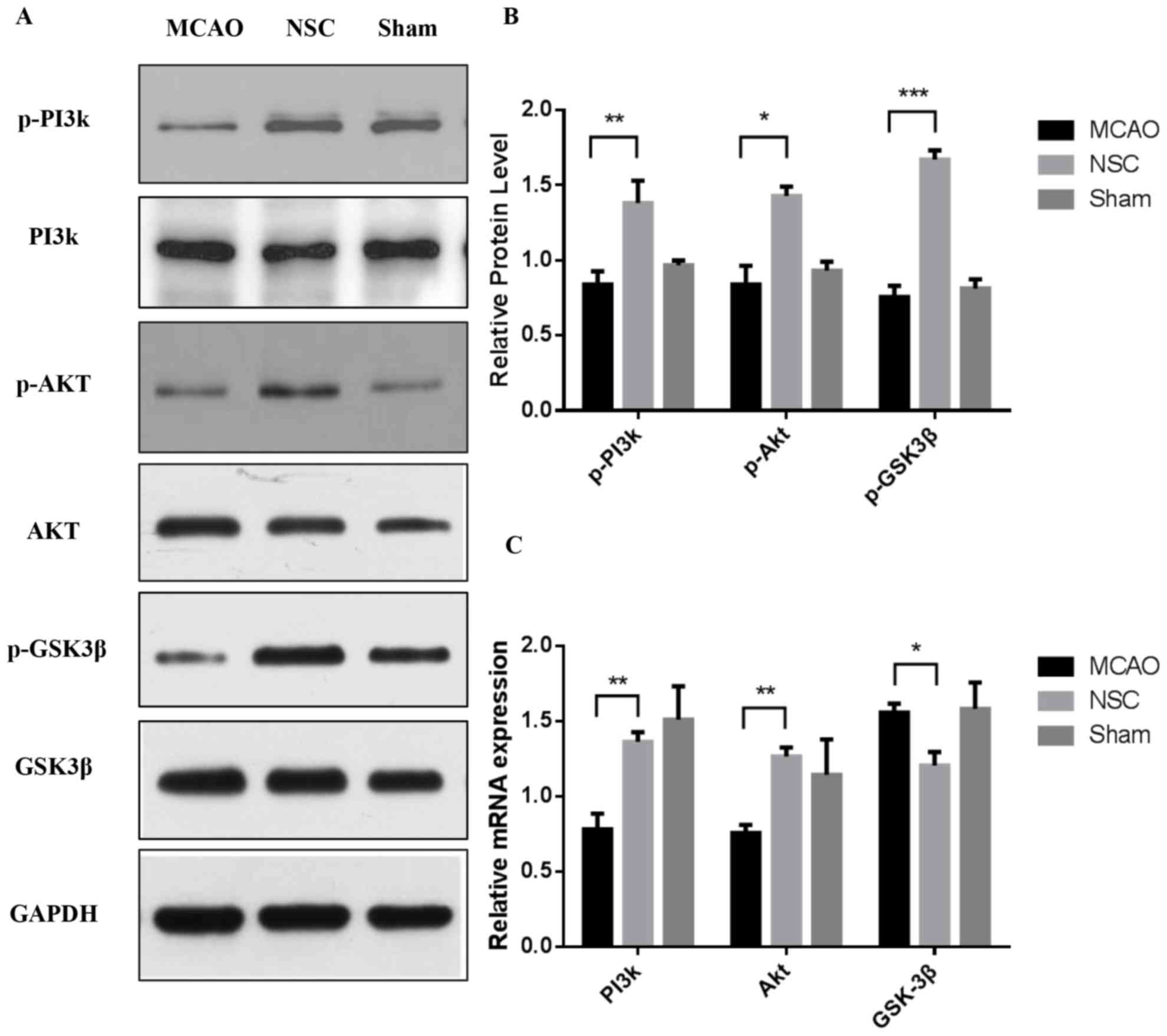 Our previous in vitro study demonstrated that phosphorylation levels of PI3k/Akt/GSK-3β were altered in neurons following NSCs treatment under OGD (unpublished data). The results of the in vivo experiments in the current study further indicated that the PI3k/Akt/GSK-3β signaling pathway may be at least partially involved in the neuroprotective effects conferred by NSCs. The expression of p-PI3k, p-Akt and p-GSK3β protein was measured using western blotting (Fig. 2A). The expressions of p-PI3k at Tyr458 (P<0.01), p-Akt at Ser473 (P<0.05) and p-GSK-3β at Ser9 (P<0.001) were significantly increased in the NSC group compared with the MCAO group (Fig. 2B) RT-qPCR analysis was performed simultaneously to measure the level of expression of PI3k, Akt and GSK-3β mRNA (Fig. 2C). The results indicated that the levels of PI3k and Akt mRNA were increased in the NSC group compared with the MCAO group (both P<0.01). By contrast, the expression of GSK-3β mRNA was significantly decreased (P<0.05) in the NSC group compared with the MCAO group.