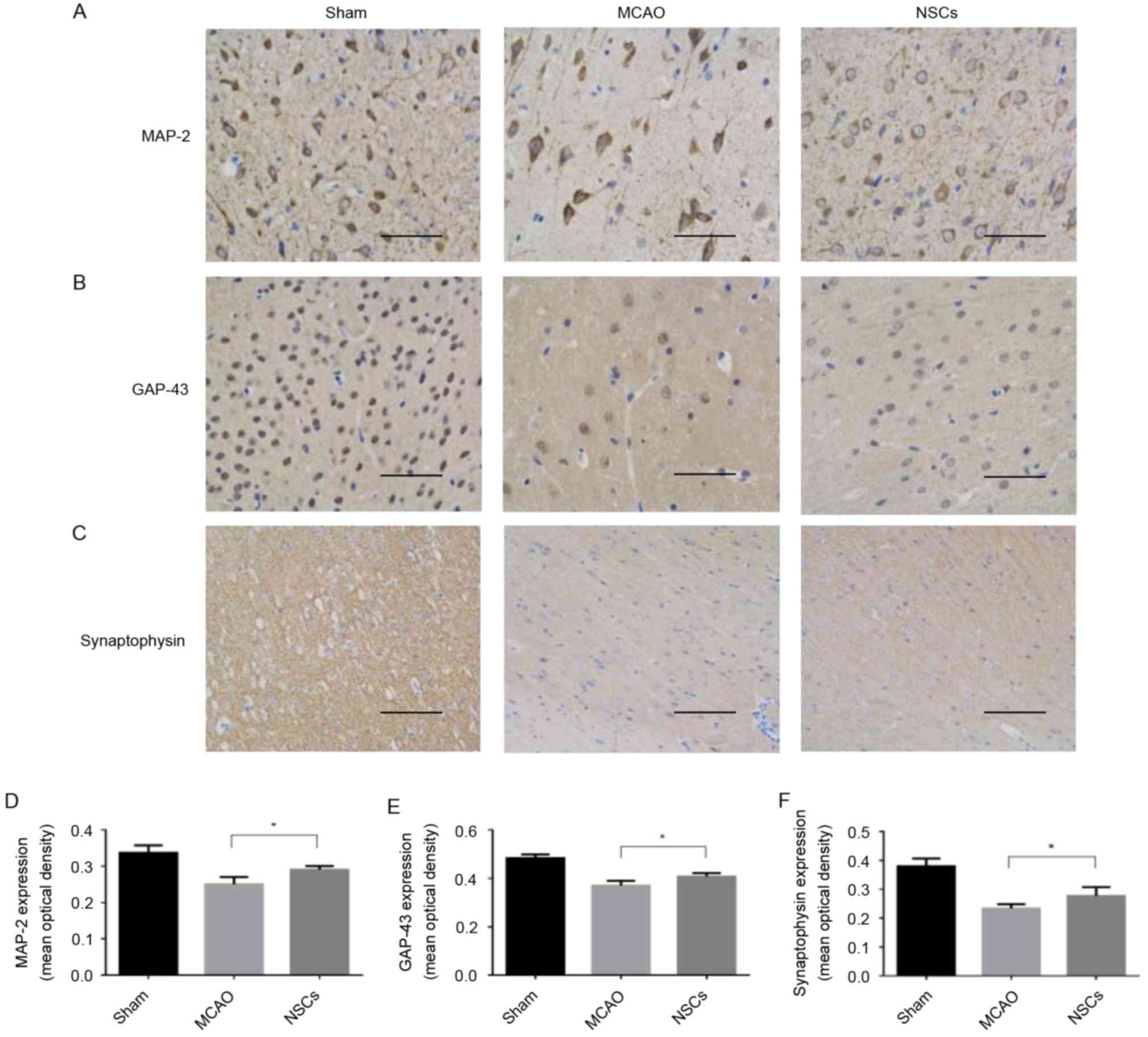 MAP-2 is a cytoskeletal phosphoprotein primarily associated with microtubules and postsynaptic densities (19). GAP-43 is an intracellular membrane-associated phosphoprotein expressed in neuronal growth cones and is involved in axonal growth, synaptogenesis, synaptic remodeling and neurotransmitter release (20). Synaptophysin is a 38-kDa calcium-binding glycoprotein present in the membranes of neurotransmitter-containing presynaptic vesicles and is used as a specific protein marker for the presynaptic terminal (21). Levels of synaptophysin serve as an index of synaptic number and density (22). The mean average intensity of MAP-2, GAP-43 and synaptophysin staining were significantly increased in the NSC group compared with the MCAO group (all P<0.05; Fig. 4).