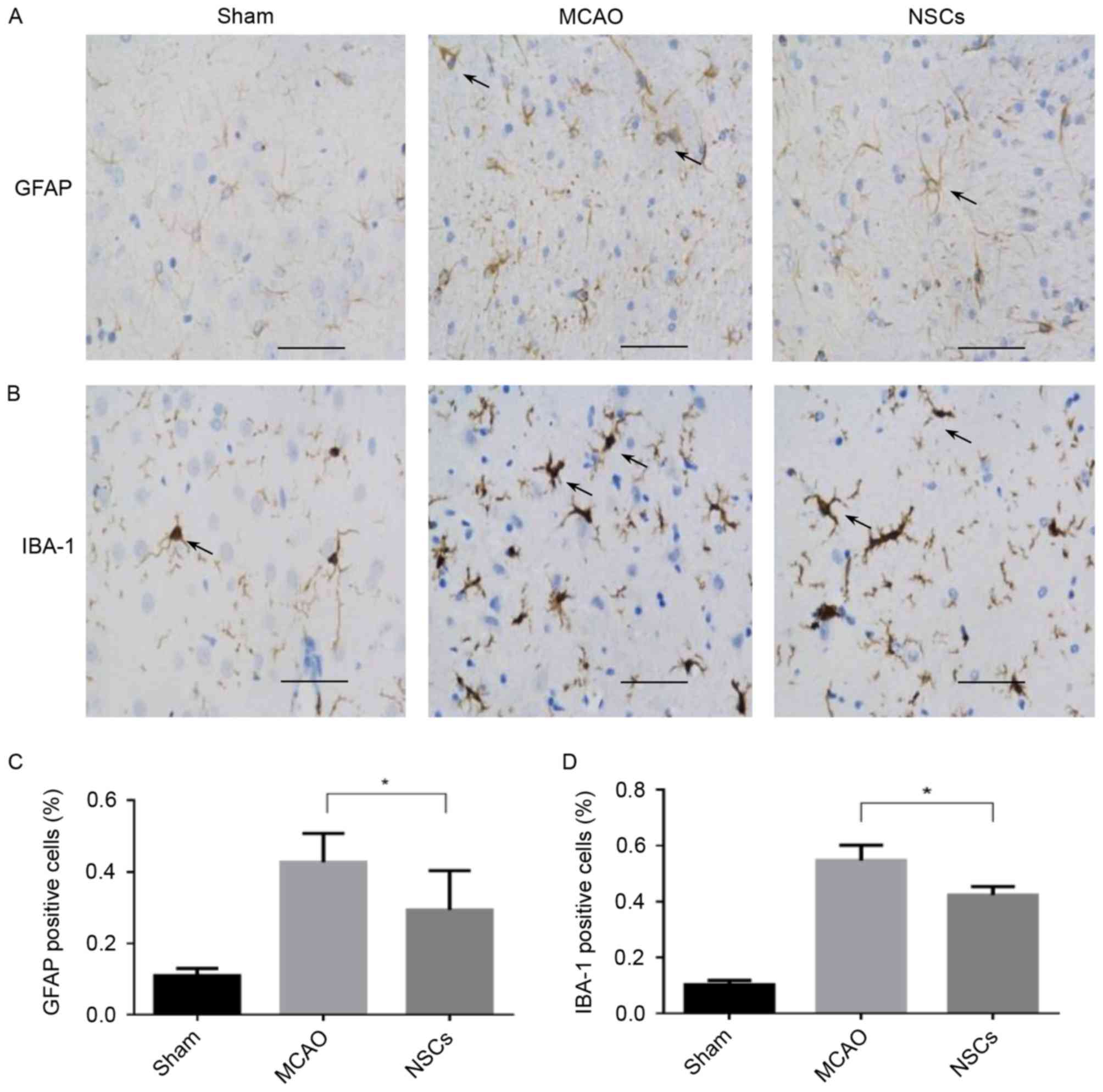 The expression of IBA-1 in the microglia and GFAP in the astrocytes increase in response to a wide variety of pathological stimuli in the central nervous system (CNS). Microglia and astrocyte activation commonly occur during the early response of the CNS to a wide variety of pathological stimuli, including axotomy, trauma, inflammation and degeneration (23). There was a significant decrease in the number of IBA-1 and GFAP-positive cells in the peri-ischemic area in the NSC group compared with the MCAO group (both P<0.05; Fig. 5).