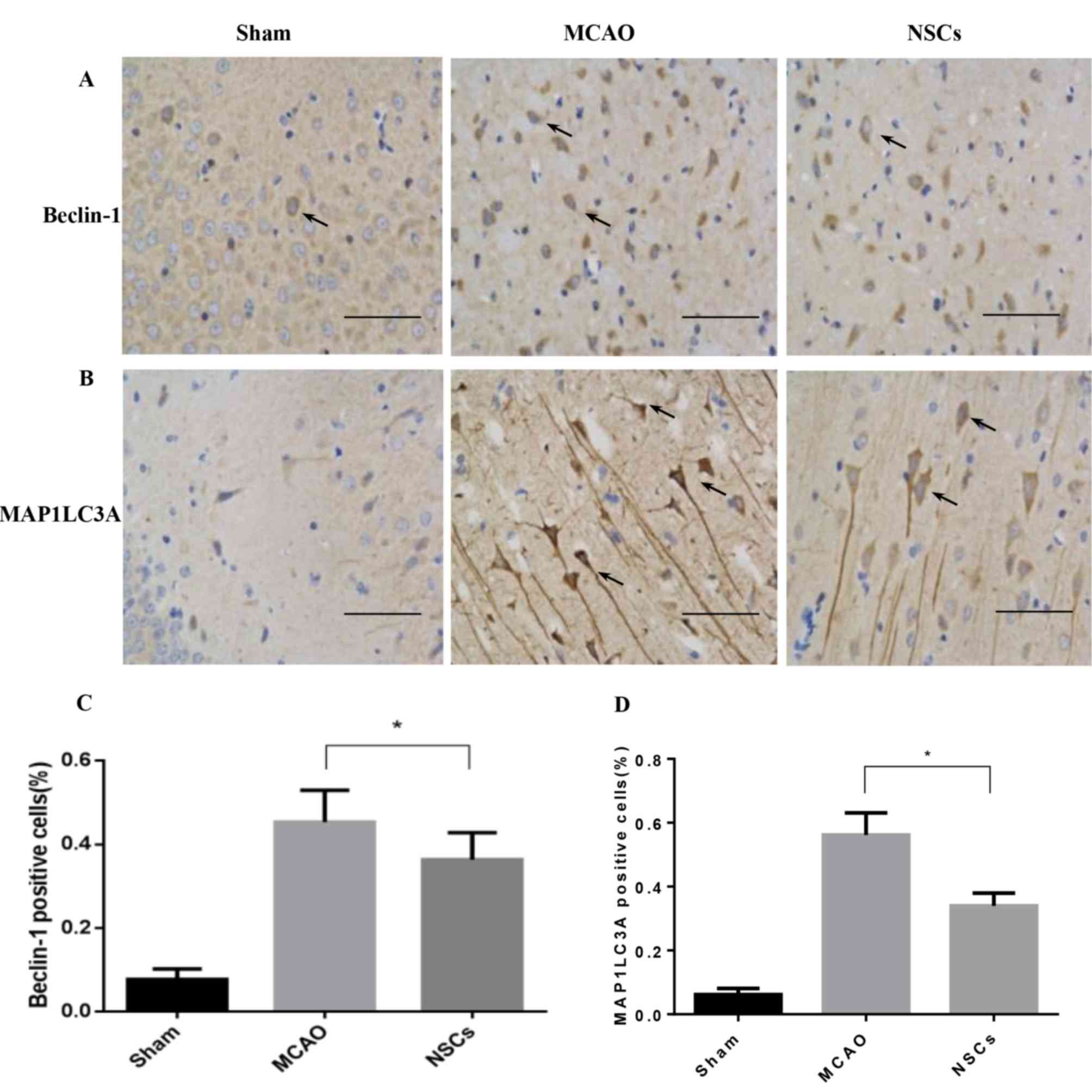 MAP1LC3 and Beclin-1 serve a pivotal role in mammalian autophagy, which is increased during periods of cell stress and extinguished during the cell cycle (24). In ischemic neurons, Beclin-1 markers were dispersed in the soma and dendrites (Fig. 6A), while MAP1LC3 was primarily located in the soma (Fig. 6B). The number of MAP1LC3-positive and Beclin-1-positive immune-reactive puncta were significantly decreased in the NSC group compared with the MCAO group (both P<0.05; Fig. 6C).