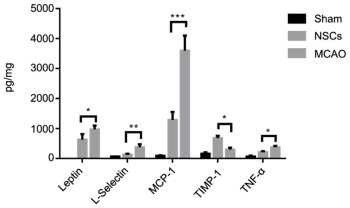 NSCs possess a strong anti-inflammatory capacity in a variety of disease models including Alzheimer's disease, Parkinson's disease and traumatic brain injury models (14). The current study demonstrated that NSC administration may modulate inflammation by reducing L-selectin, leptin, MCP-1 and TNFα production and increasing TIMP-1 levels.