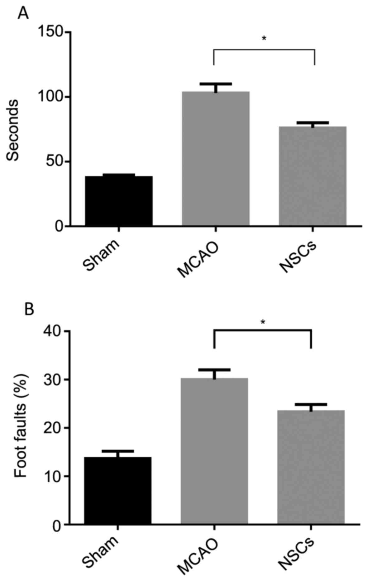 The foot-fault and adhesive removal tests conducted 3 days following stroke onset indicated that all MCAO and MSC-treated rats exhibited severe neurological deficits. Treatment with NSCs initiated 24 h following stroke onset significantly improved performance on the adhesive removal test (P<0.05; Fig. 8A) and foot-fault test (P<0.05; Fig. 8B) compared with the MCAO group. These results indicate that NSCs may have the capacity to improve functional outcomes in mice with stroke.