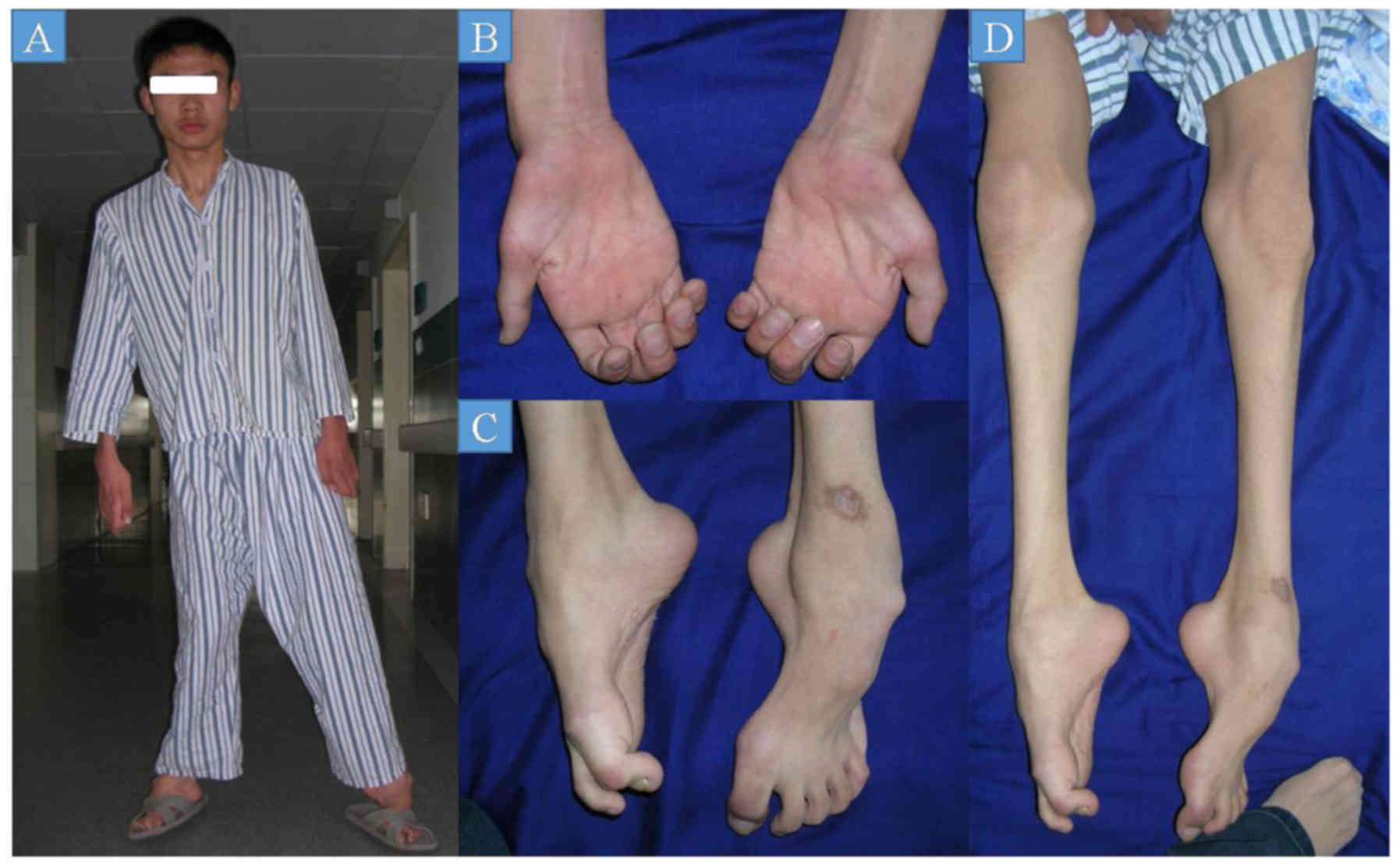 All 7 affected patients expressed manifestations of bilateral finger contractures and a gait abnormality because of pes cavus, lower limb weakness, foot drop and deformities. The proband (III2) initially presented with symptoms at age 4 years (Fig. 2). Patient (II3) had similar pes cavus, foot muscle atrophy, strephenopodia, and presented with symptoms at age 7 years. Patient (II6) had more critical symptoms, such as lower limb atrophy and limited walking ability after age 30 years with upper limb weakness. The present findings indicated that the clinical manifestations and developmental progression of all affected family members were similar, but the age of initial onset was slightly different, with men aged 3–4 and women 7–8 years. In addition, the male patients exhibited more severe symptoms than the female patients, and they lost their ability to walk independently after age 30. The electrophysiological examinations were performed on 3 patients (III3, III4, and IV1). The results (recorded in the case history without the electromyogram) exhibited milder NCV changes. Based on the results of the physical and electrophysiological examinations, the disease of this family was diagnosed as CMT2.