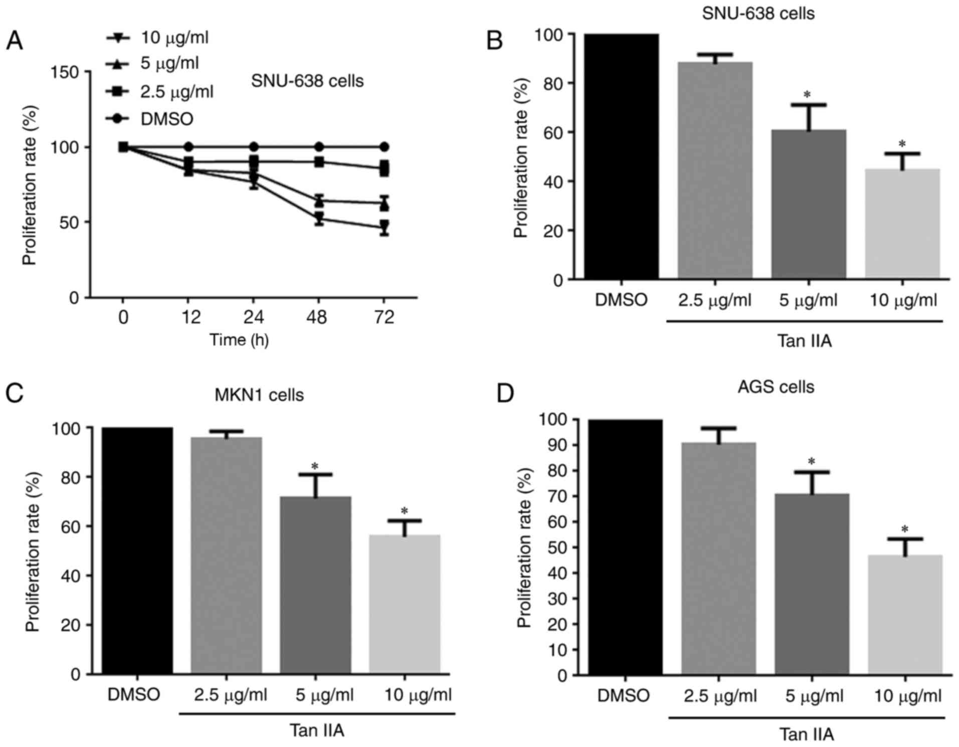 Human gastric cancer cell lines (SNU-638, MKN1 and AGS) were obtained from the Cell Resource Center (Chinese Academy of Sciences, Shanghai, China). SNU-638 and MKN1 cells were cultured in RPMI 1640 medium (Thermo Fisher Scientific, Inc., Waltham, MA, USA) supplemented with 10% fetal bovine serum (Thermo Fisher Scientific, Inc.) and AGS cells were cultured in Dulbecco's modified Eagle's medium (Invitrogen; Thermo Fisher Scientific, Inc.) supplemented with 10% fetal bovine serum (Thermo Fisher Scientific, Inc.). Cells were cultured at 37°C in a humidified atmosphere containing 5% CO2. Tan IIA was obtained from Sigma-Aldrich (Merck KGaA, Darmstadt, Germany; purity, ≥97%) and dissolved in dimethyl sulfoxide (DMSO) to make 2.5 µg/ml stock solutions. Gastric cancer cells were treated with Tan IIA in different times (0, 12, 24, 48 and 72 h) or concentrations (0, 2.5, 5 and 10 µg/ml) at 37°C in humidified air and 5% CO2 atmosphere.