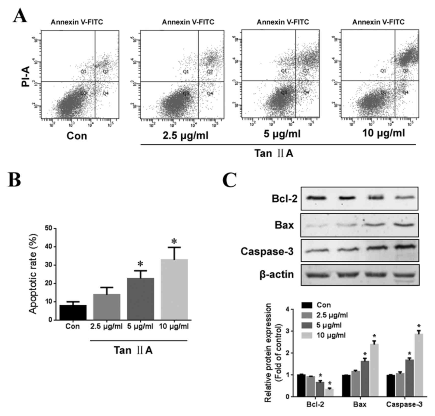 The apoptotic effects of Tan IIA were assessed using Annexin V-FITC and PI apoptosis double staining. Tan IIA treatment induced a significant dose-dependent increase in apoptosis (Fig. 2A and B). Furthermore, Tan IIA treatment increased the expression of Bax and cleaved caspase-3, as well as decreasing the expression of Bcl-2 (Fig. 2C). These results suggest that Tan IIA treatment induces gastric cancer cell apoptosis.