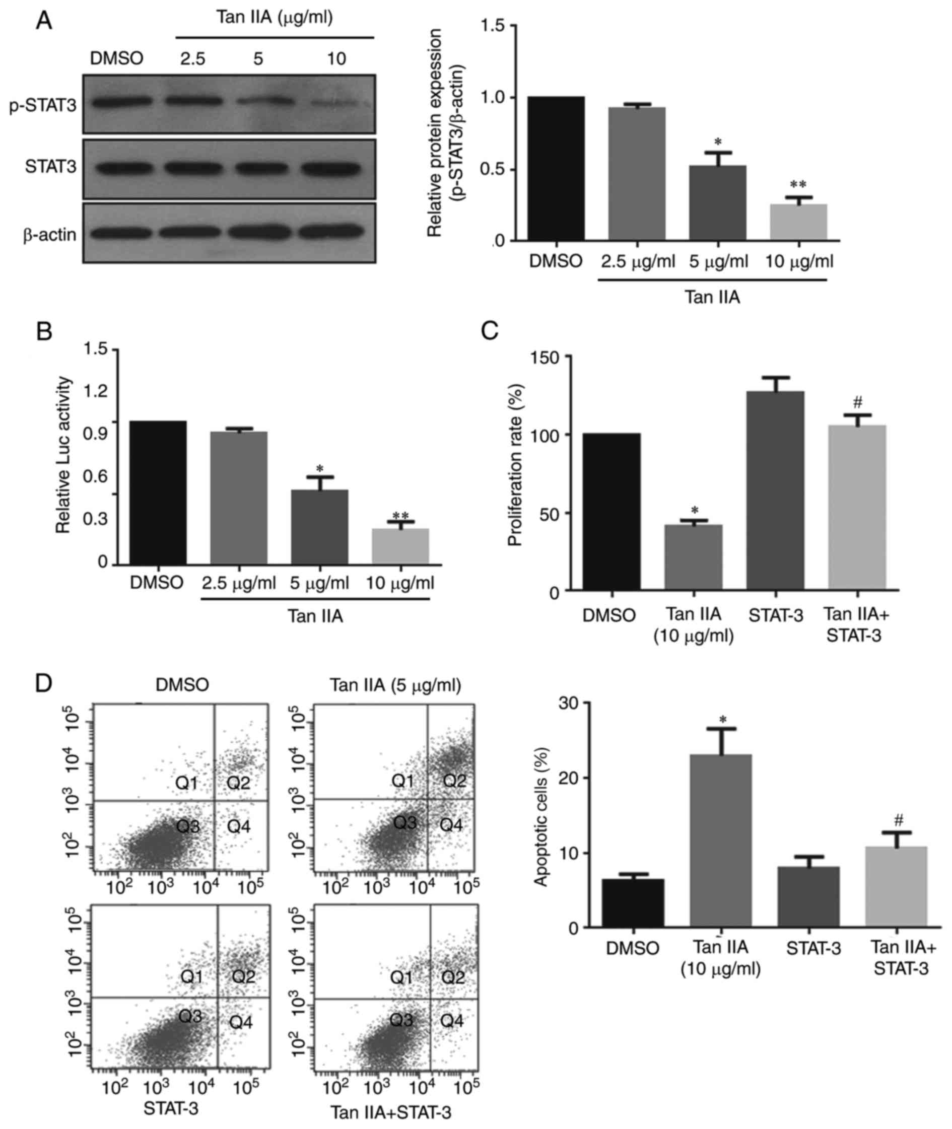 To examine whether Tan IIA inhibits gastric cancer cell proliferation via the inhibition of STAT3 signaling. Treatment with 5 or 10 µg/ml Tan IIA significantly inhibited STAT3 phosphorylation at Tyr705 by ~54 and ~77%, respectively (Fig. 3A). Furthermore, Tan IIA treatment significantly reduced STAT3 trans-activity (Fig. 3B). To further confirm whether STAT3 signaling is associated with the anti-proliferative effect of Tan IIA, SNU-638 cells were co-transfected with a STAT3 reporter plasmid (pSTAT3-LUC). The results demonstrated that STAT3 overexpression significantly reversed the Tan IIA-induced inhibition of cell growth and apoptosis, suggesting that STAT3 is required for Tan IIA-induced cell growth inhibition in gastric cancer cells.