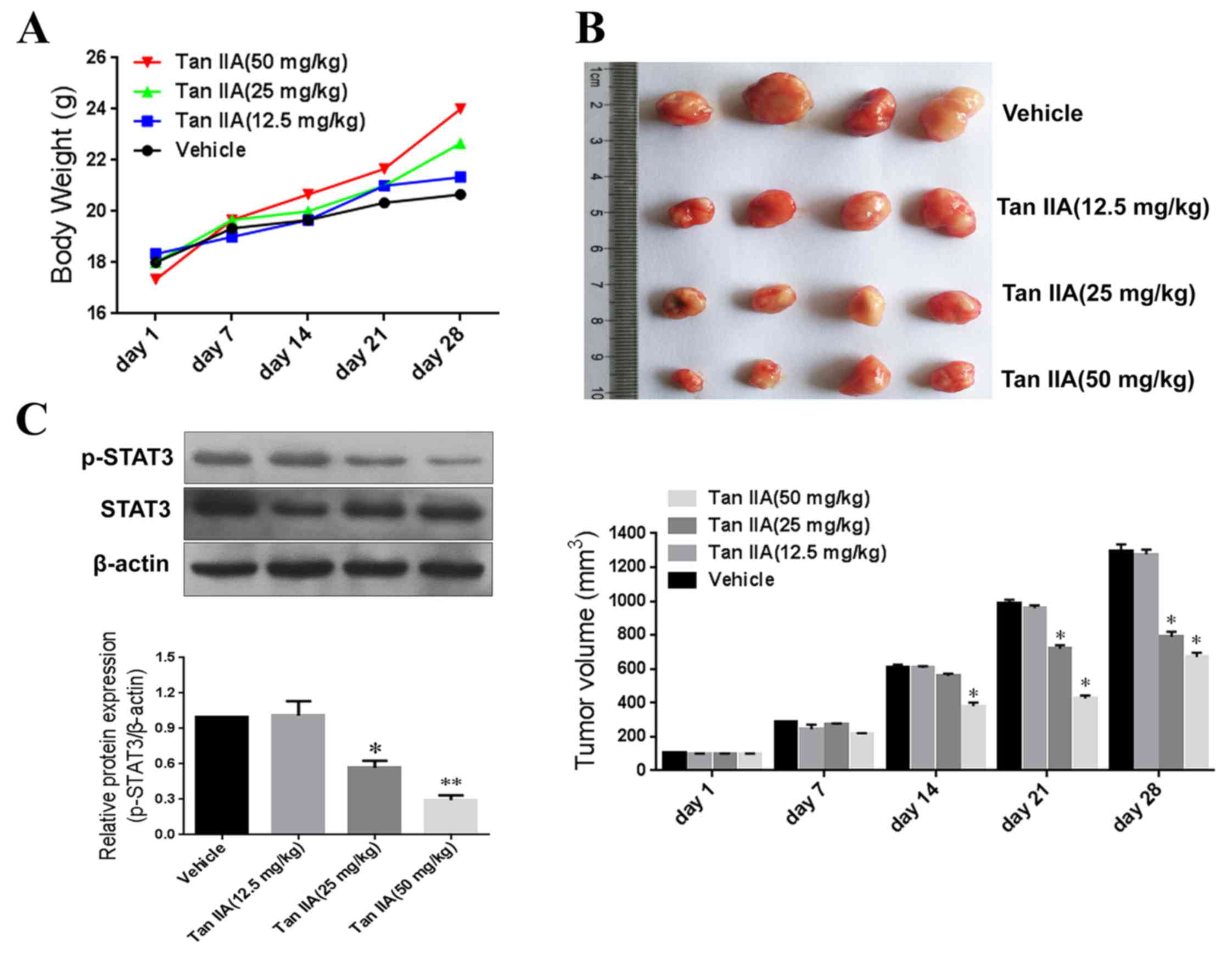To further examine the anti-tumor efficacy of Tan IIA in vivo, a xenograft model of human gastric cancer was constructed using mice. No significant differences in body weight were observed between the treatment groups (Fig. 4A); however, tumor volumes were significantly smaller in the Tan IIA-treated groups (25 and 50 mg/kg) compared with the control after 21 days of treatment (Fig. 4B). In addition, Tan IIA treatment significantly inhibited STAT3 phosphorylation (Fig. 4C). These results suggest that Tan IIA-mediated inhibition of tumor growth occurs via the suppression of STAT3 signaling.