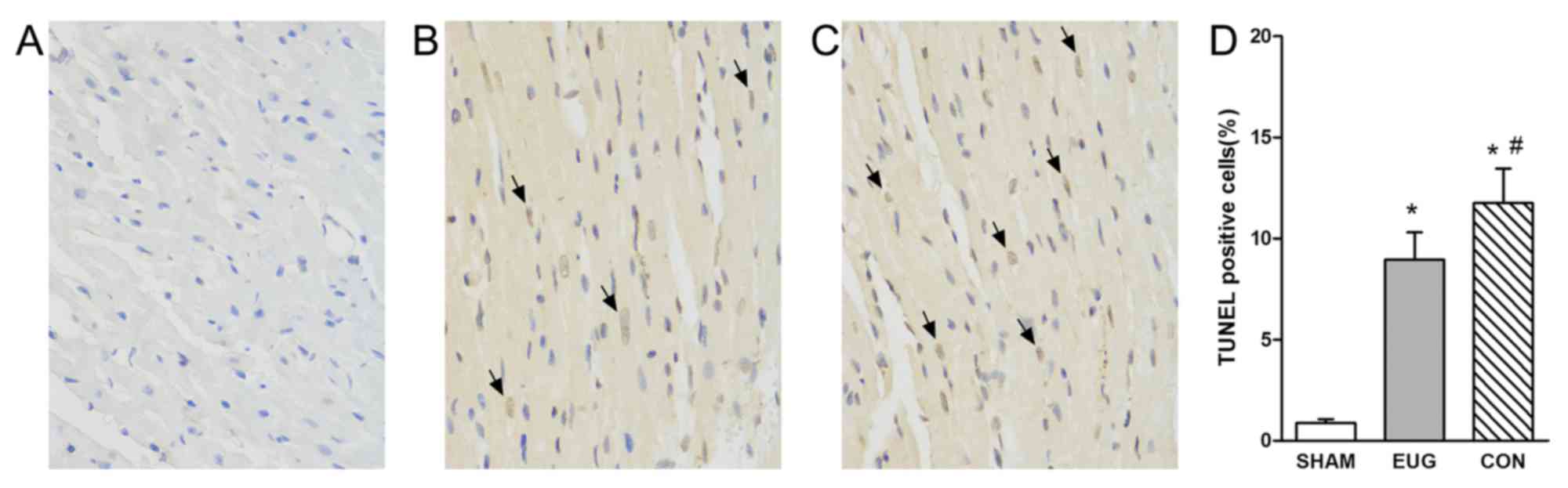In addition to Western blot analysis, TUNEL staining was used to characterize apoptosis, which provided knowledge about myocardial damage based on DNA breaks. Compared with the sham group (apoptosis rate, 0.88±0.19%), heart transplantation treatment resulted in an increase in the percentage of TUNEL-positive cells in the eugenol (apoptosis rate, 8.95±1.35%) and control (apoptosis rate, 11.75±1.71%) groups (Fig. 4). In comparison with the sham group, the percentage of TUNEL-positive cells significantly increased in the eugenol and control groups (Fig. 4). The reduction of TUNEL-positive cells in the eugenol group compared with the control group demonstrated the effects of eugenol on apoptosis.