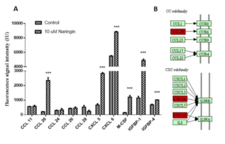 Based on the search criteria for differential secretion used in the present study, Statistical analysis resulted in identification of three cytokines (relative level, >1.5-fold control). Increased secretion of cytokines CXCL5, CXCL6 and CCL20 followed induction with naringin. The differentially secreted cytokines are presented in their interaction pathways, including IL-8RB, IL-8RA and CCR6 according to the cytokine-cytokine receptor interaction pathway (hsa04060; http://www.kegg.jp/kegg-bin/show_pathway?hsa04060+6364) in the Kyoto Encyclopedia of Genes and Genomes database (Fig. 3B).